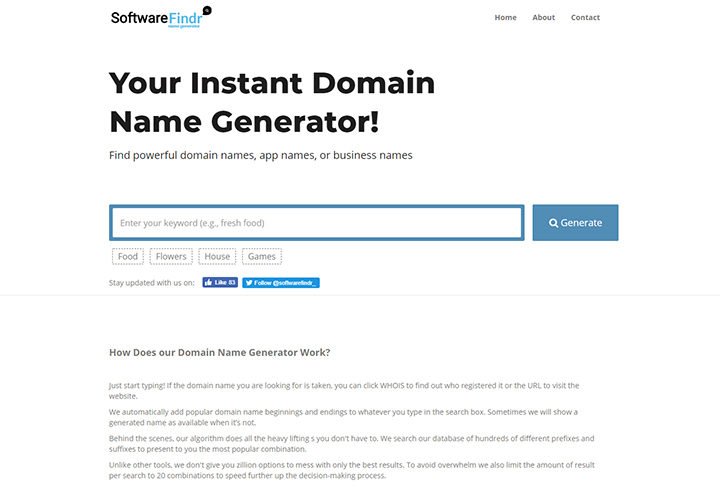 Softwarefindr instant domain name generator allows you to quickly brainstorm and find suitable names that are available for purchase. Softwarefindr quickly suggests the best combination and variety of keywords. The results are organized in an easy to read manner with the focus on consumption not to overwhelm users.