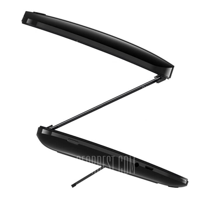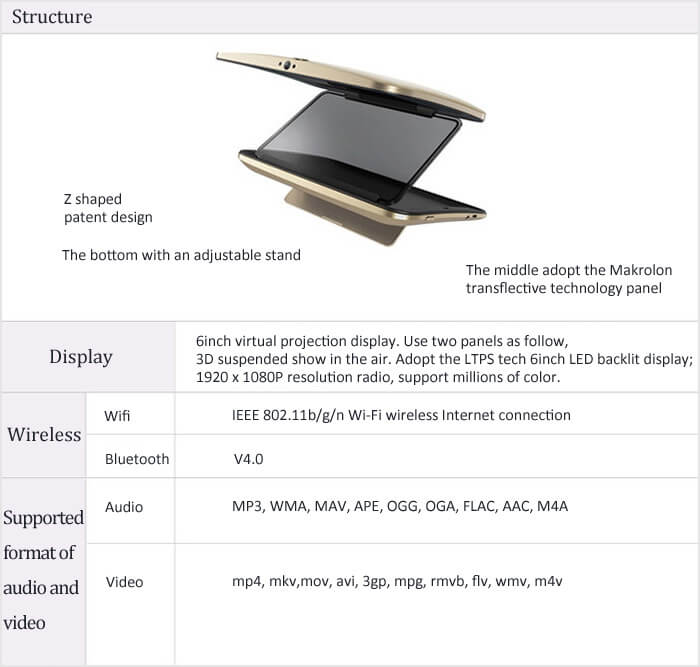 The device is shaped like a “Z”. This makes it different than any other tablet I have seen.  It has Bluetooth 4.0, is an android device but also says it supports iOS 8.0. It has 2GB DDR3 ram, 8GB storage, and can support a 64GB micro SD card. The camera is 2MP with an 80 degree viewing angle. It will track your eyes to keep the #D display looking 3D even when you look around a bit.