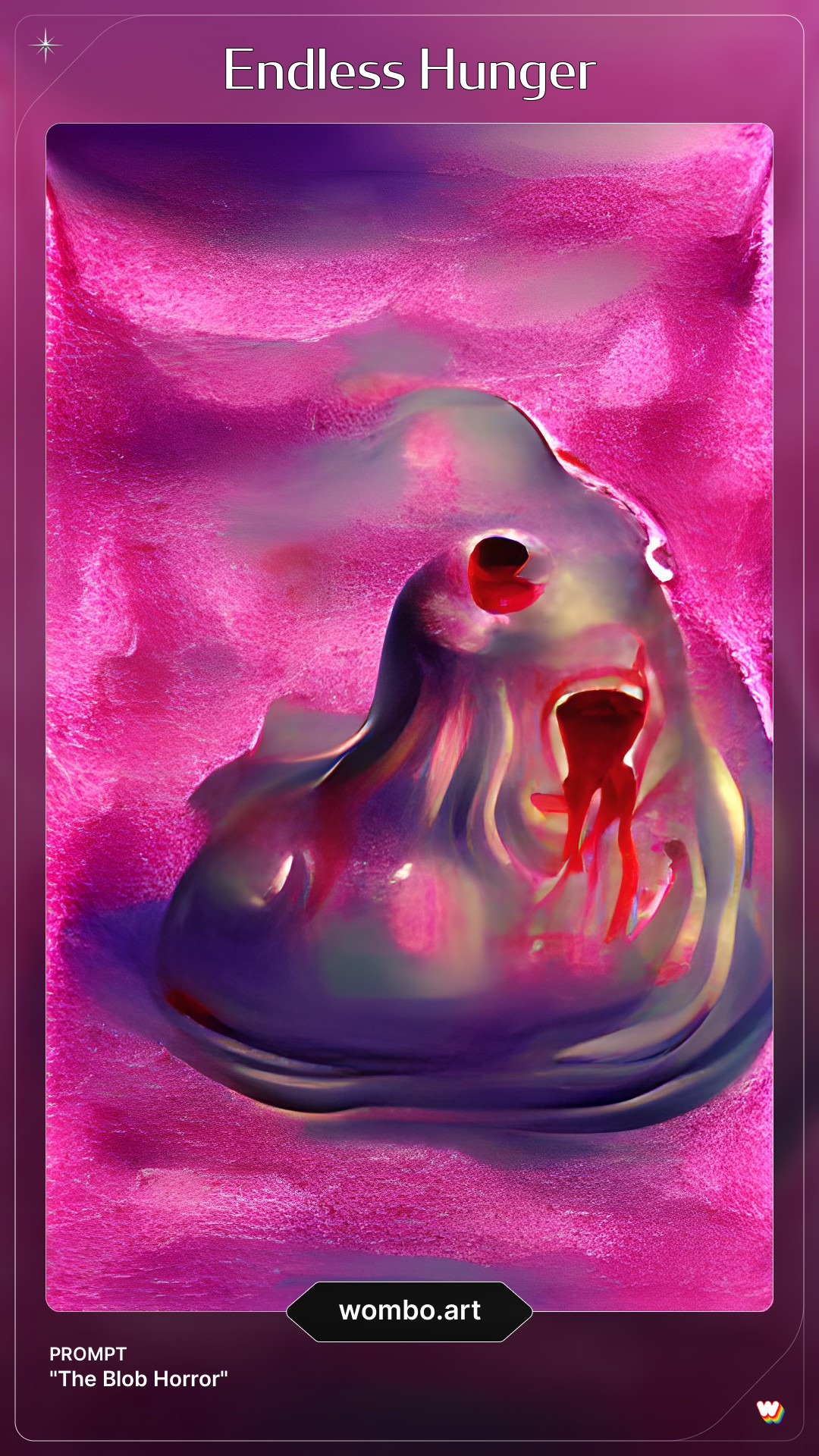 Unfortunately, this one isn’t as great as the other pieces, though it does still hold up, the blobs iconic pinkish-red hues still present, along with a bit of a gelatinous goo drop, though personally, I feel it’s lacking, but that’s the nice thing with Wombo. Don’t like the look of a piece? Try again. Inputting the same keywords will produce a unique piece of art each time.