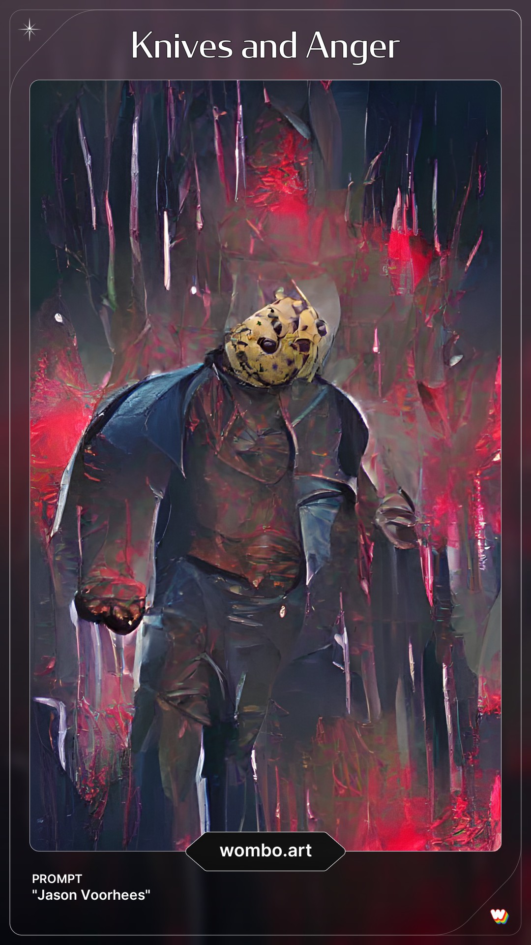 Wombo is an application and site available on PC, Mac, IOS, and Android, that generates art using nothing but keywords, an optional genre of art selection, and its AI produces some rather interesting-looking results before spitting them out in you in a trading card format. Despite my initial guess that this would be something on par with the NFT art you currently see, it’s quite interesting to look at. So as a little experiment both to show you how the site works and for my own amusement, I’ll be typing in six famous horror movie antagonists’ names just to see what we get. Keep in mind, these are somewhat abstract, but given the nature of how it generates pieces, that’s to be expected.
