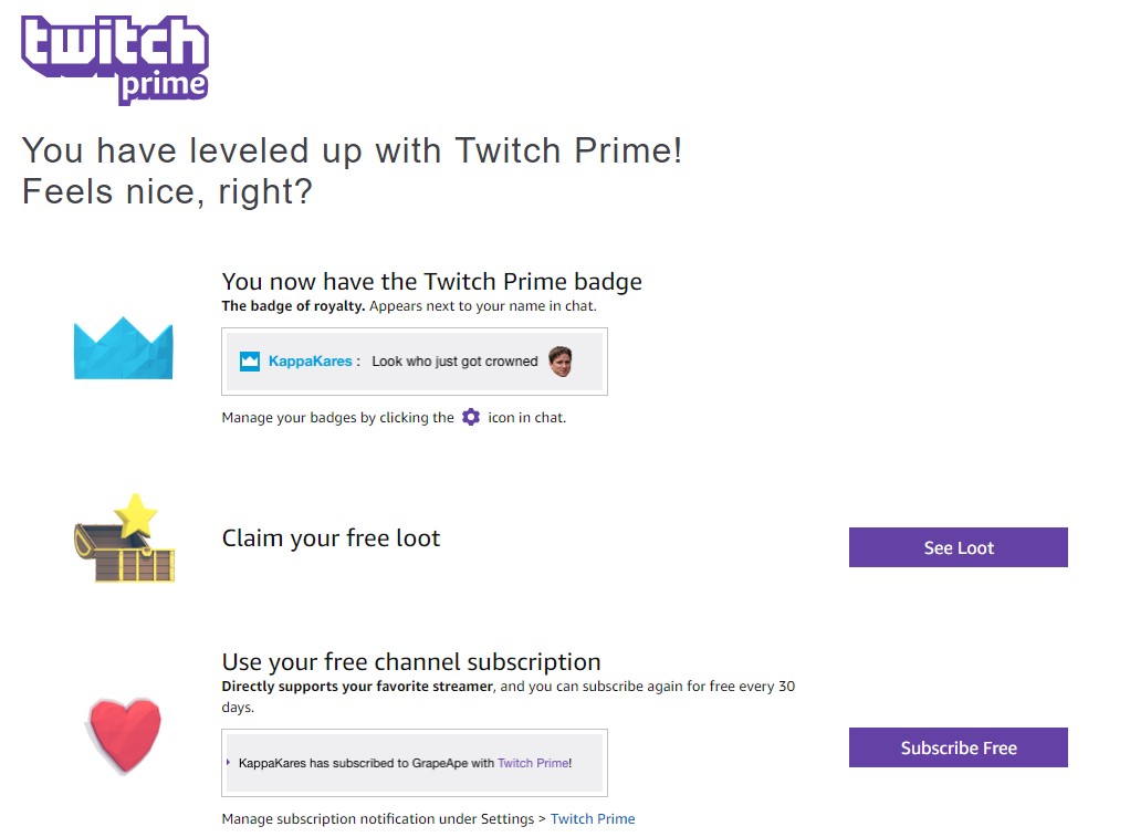 After you authorized it you should get a confirmation from Amazon that you have leveled up with information on what you can now do with your Twitch Prime.