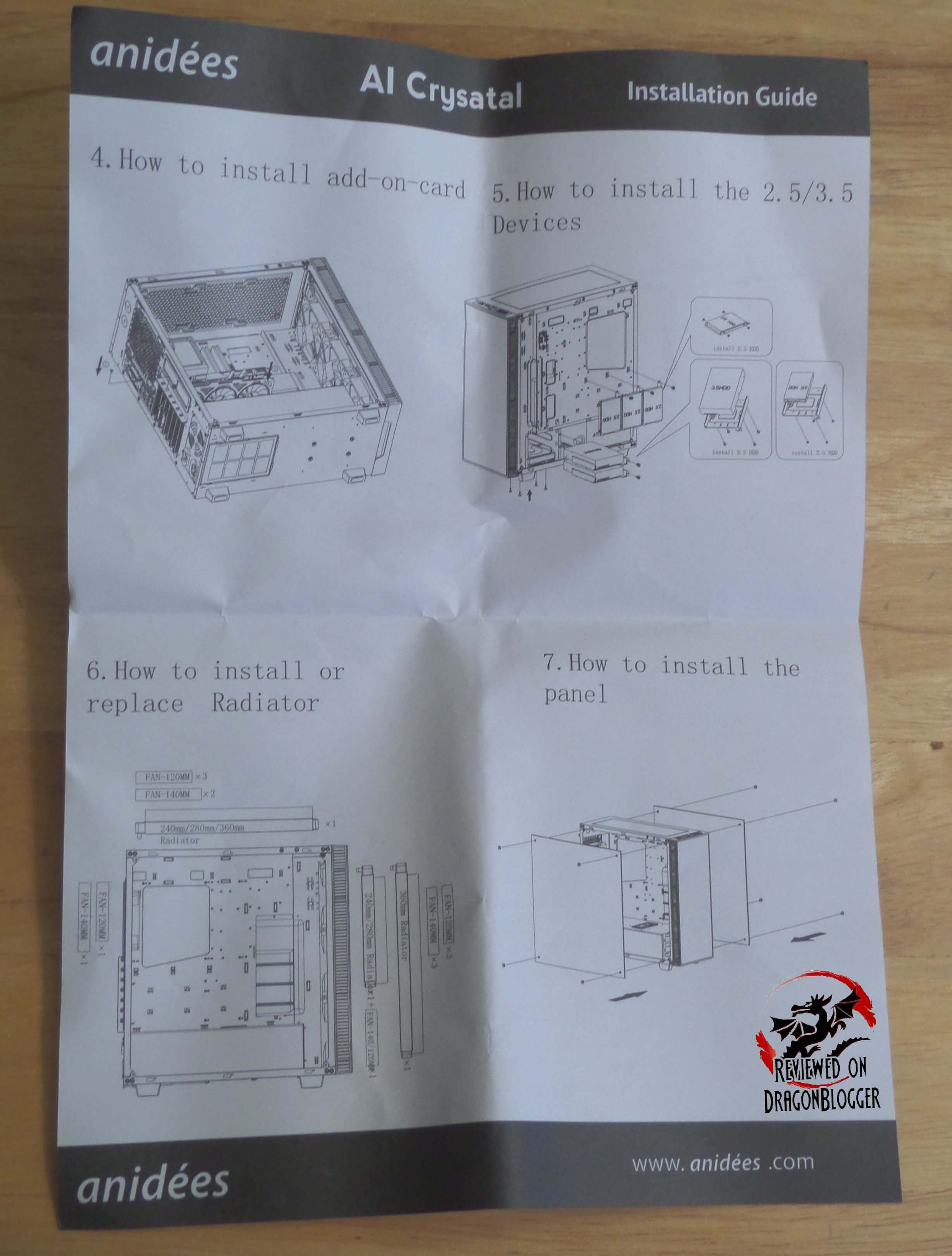 On the other side, they give you a general instruction on how to install a card, 2.5/3.5in drives, then the individual areas where you can install radiators and what size radiators for liquid cooling then how to put the panels back on.