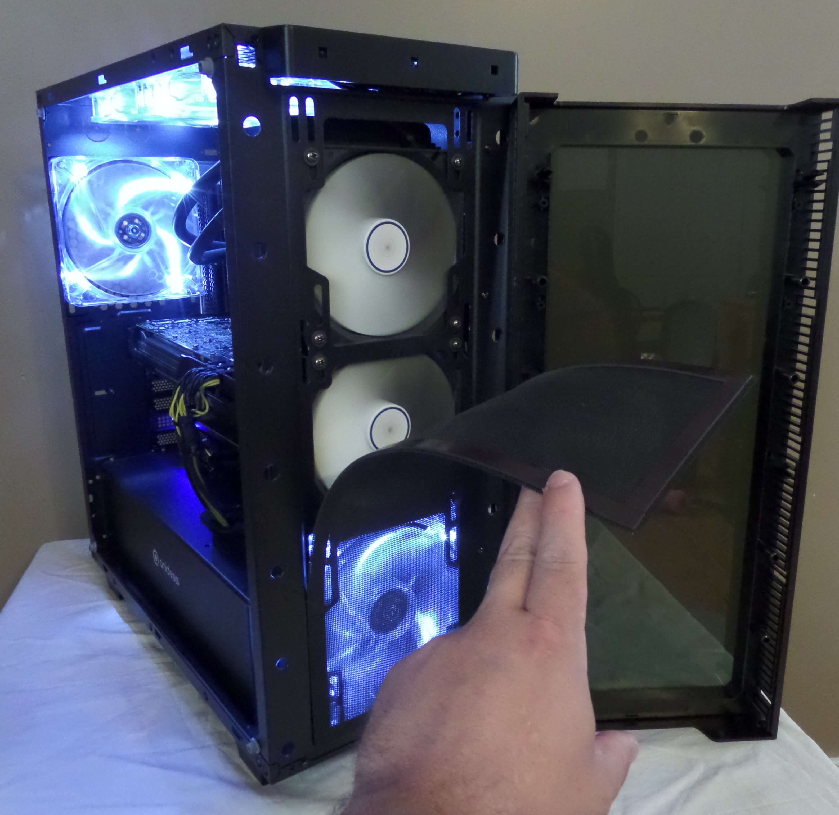 Around the front, I removed the front panel, which completely comes off, no cables holding it in place to show you how the front filter is removed.  You can’t tell because the bottom fan is lit in my configuration, but the filter does go over it too.