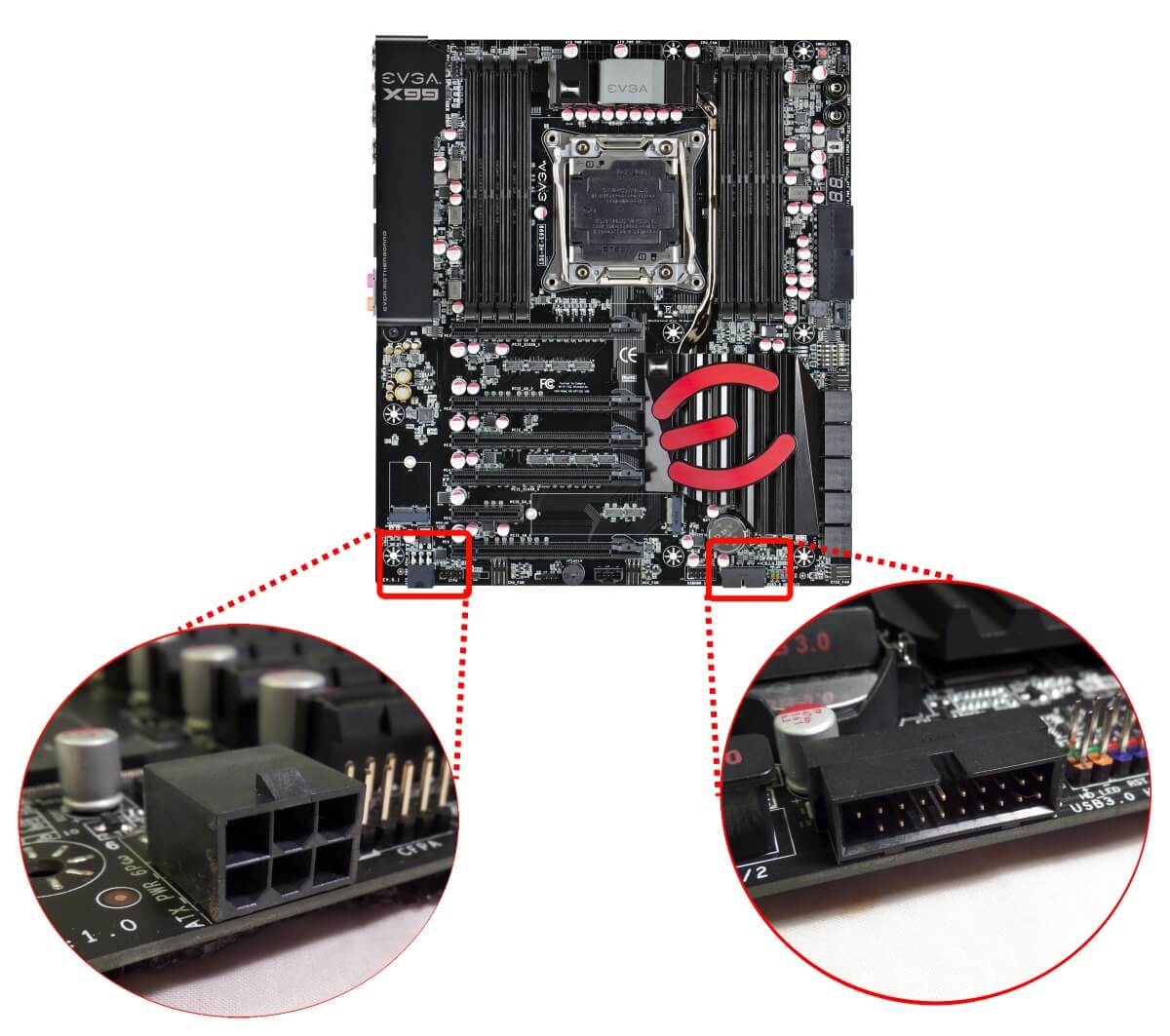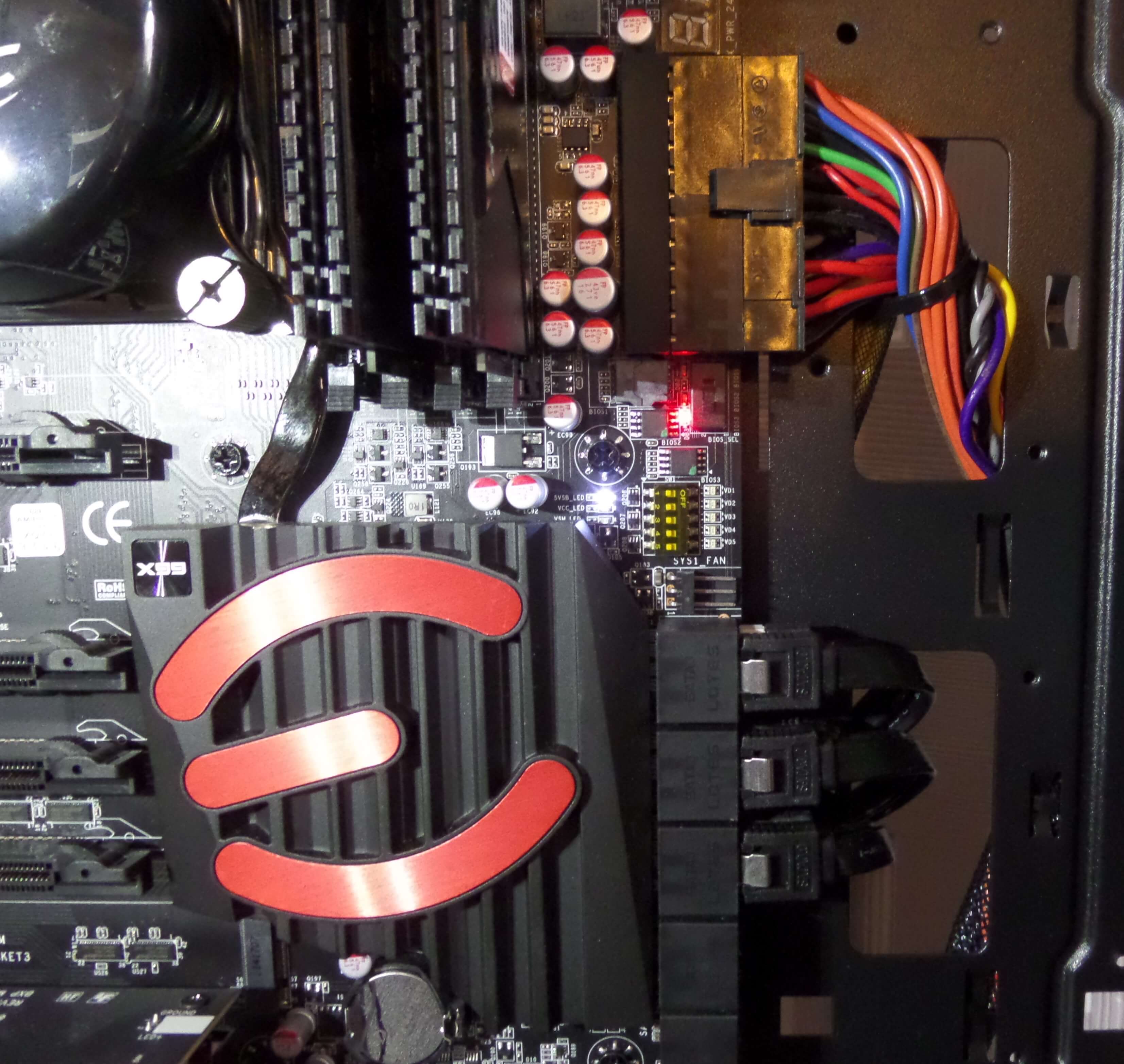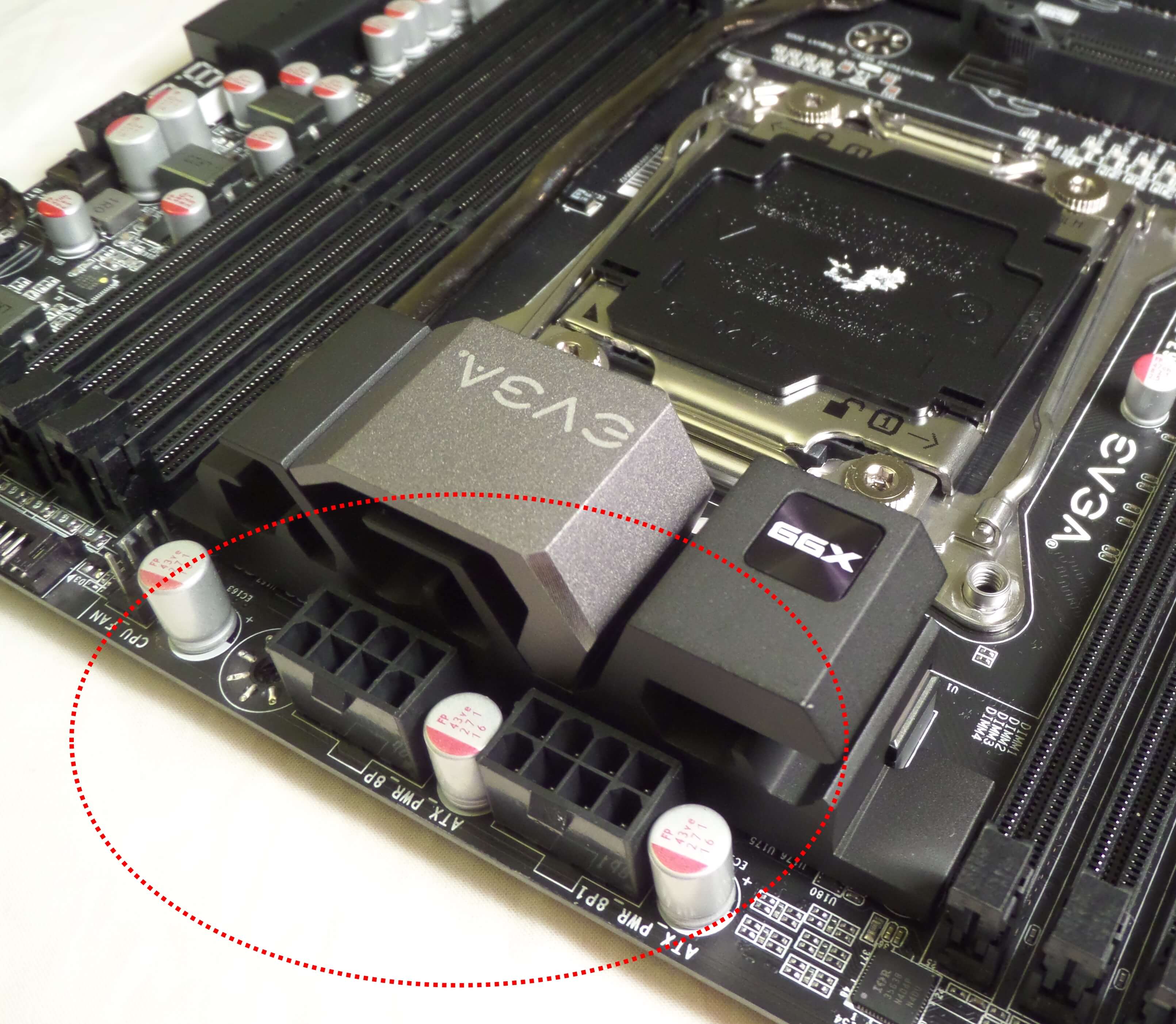 There you can see the EVGA X99 Classified seated in the case, but those 2 highlighted ports are flush on the bottom of the power supply housing.  Let’s zoom in a little more to see why there is an issue.