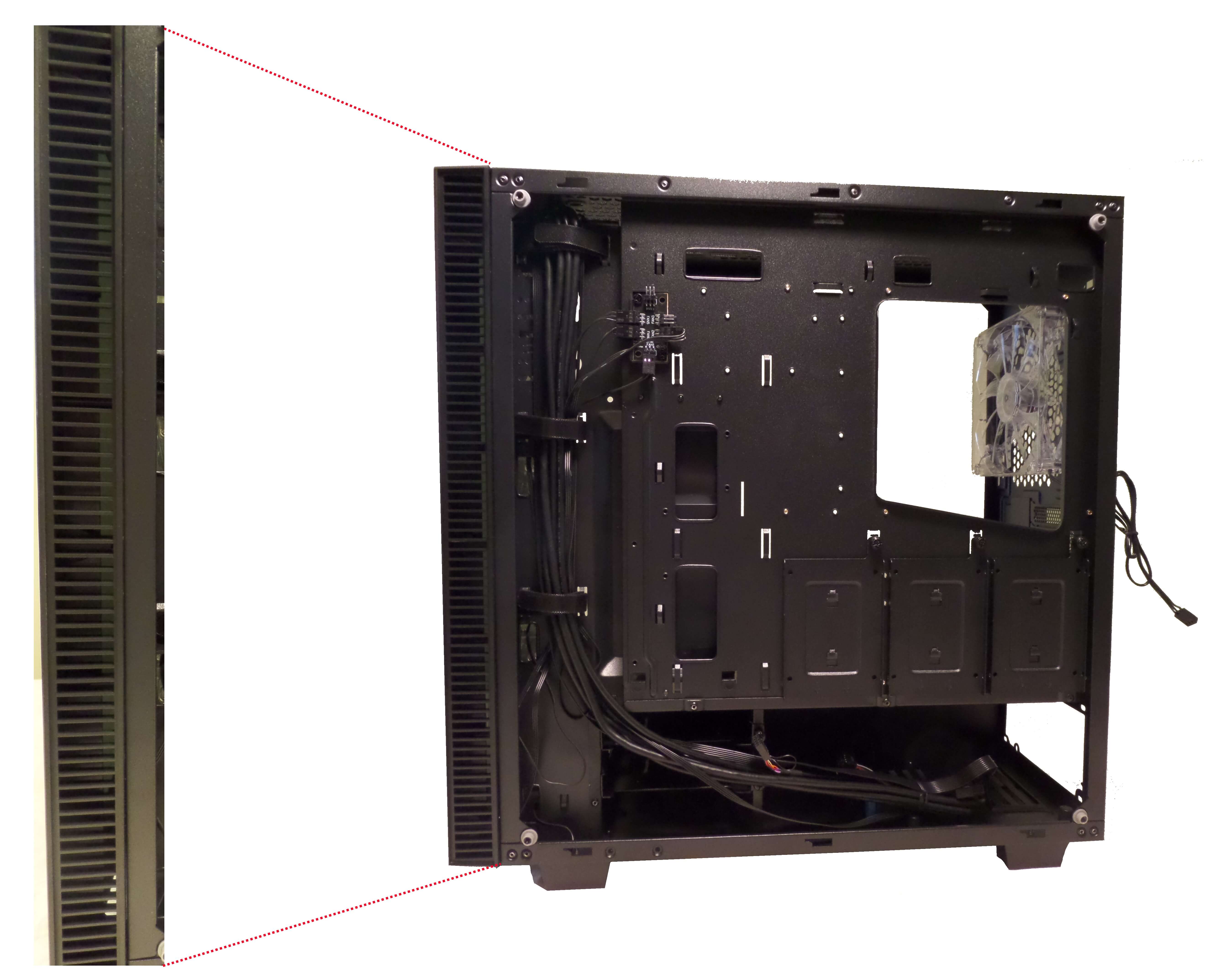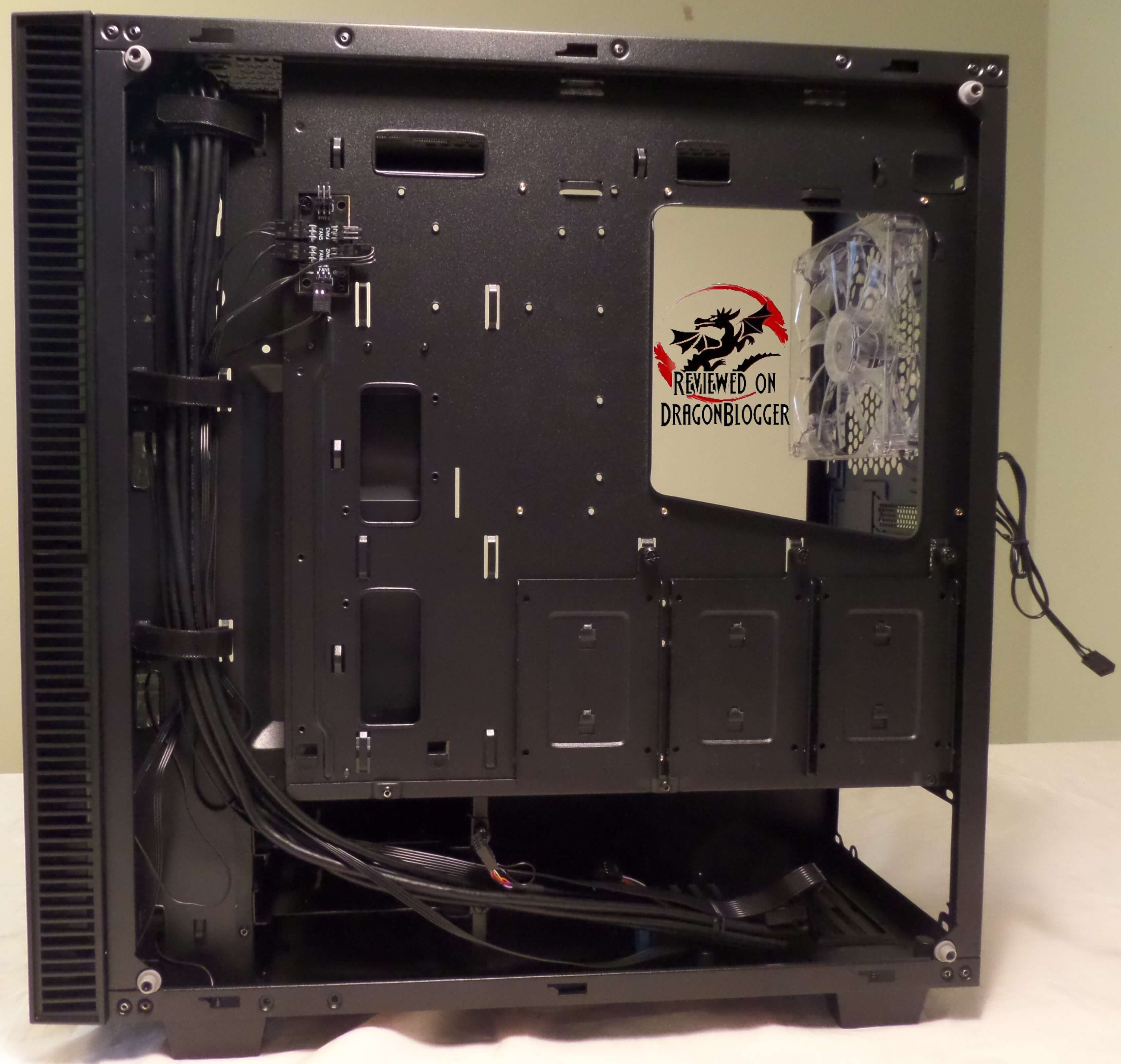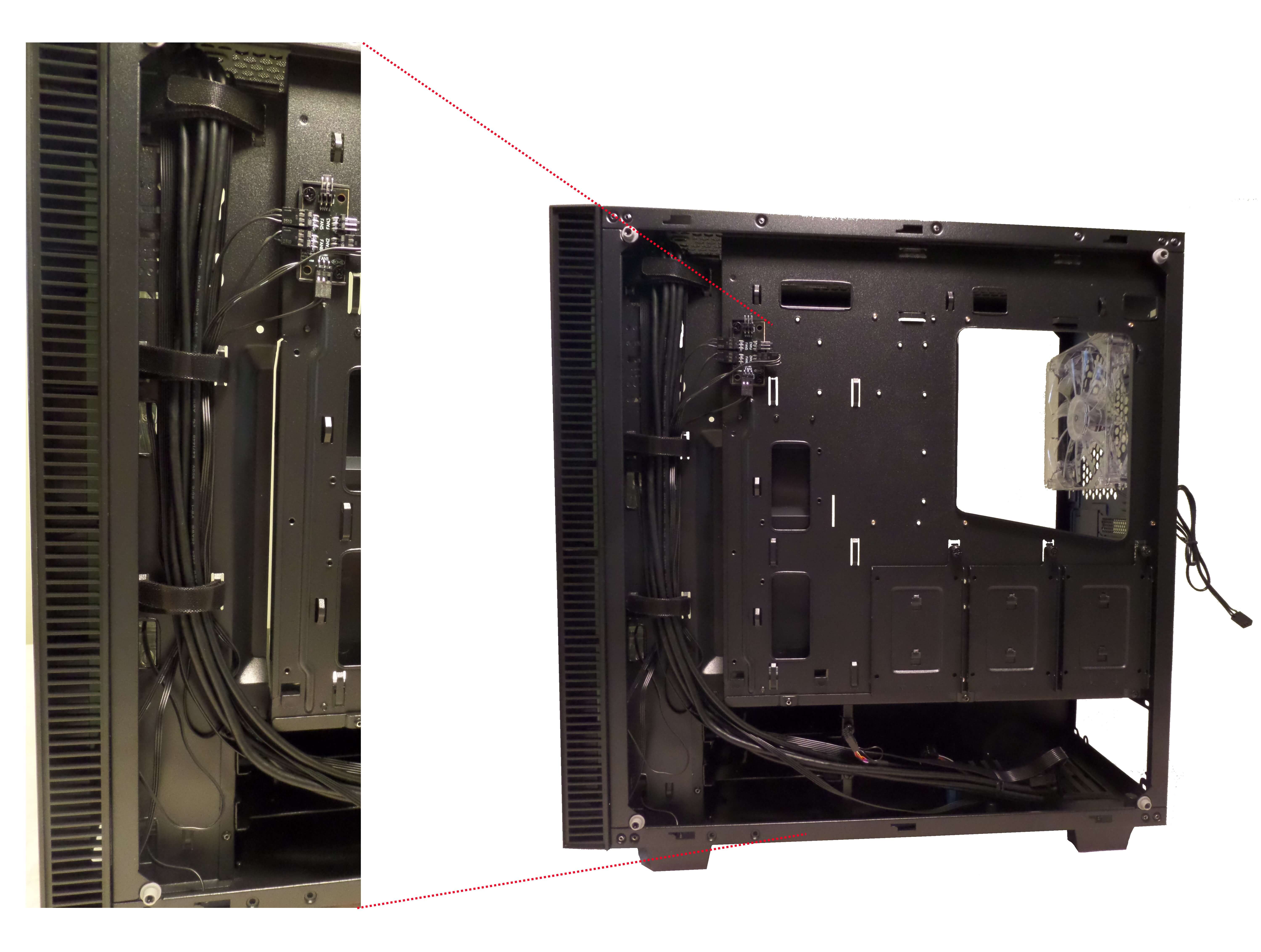 On the left of the case, we can see all of the cables leading to the front panel ports coming out and nicely strapped in to help for cable management.  This also aids in allowing for the side panel to be a little easier to screw in since the spot is recessed.