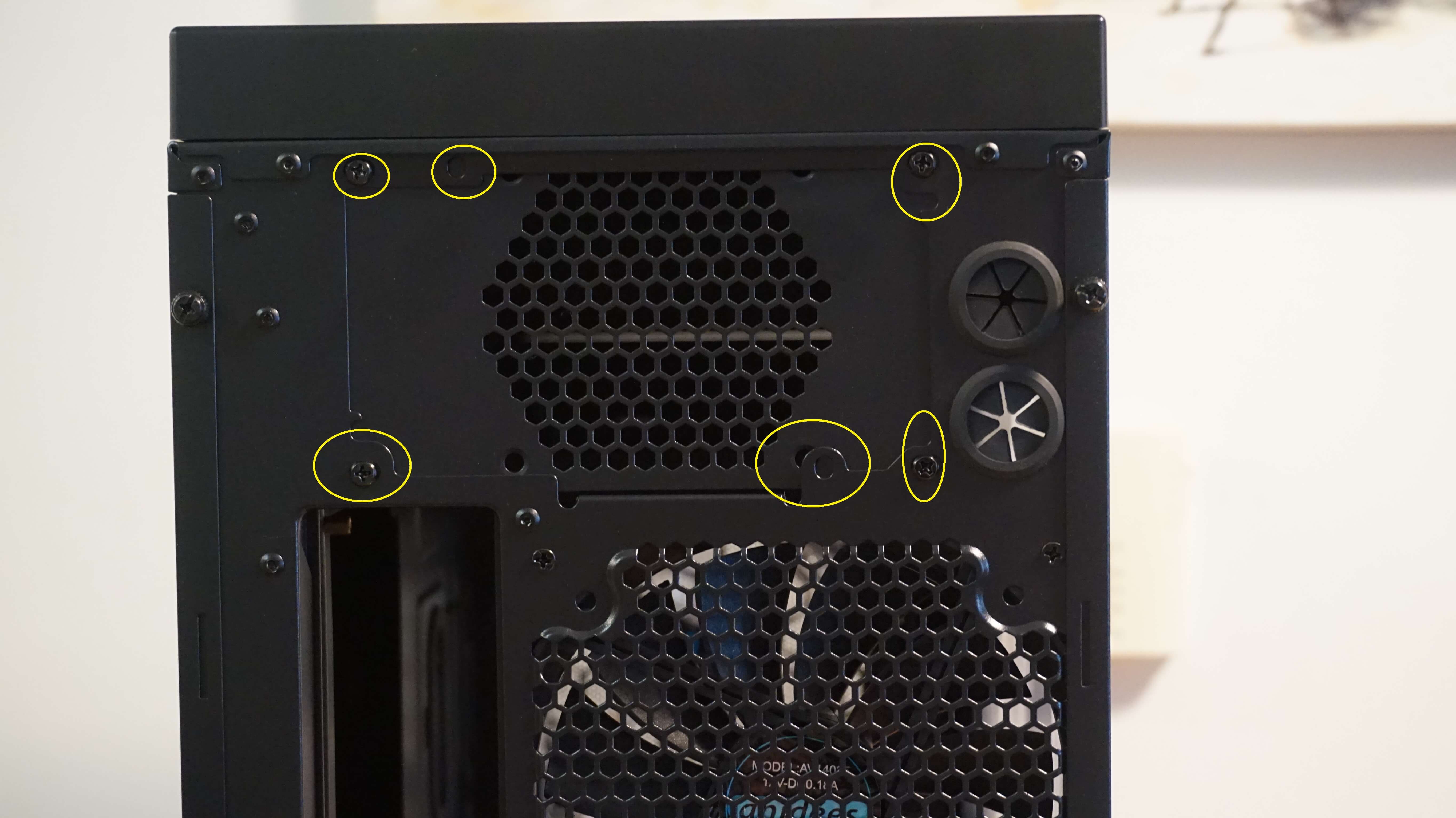 The one thing this case offers that others don’t is a place for two Power Supplies. Or just placing one in two different areas. You can either place one on the upper half of the case. Or on the bottom half in the normal area. I will post a picture of the top placement with the screw holes circled for you in yellow.