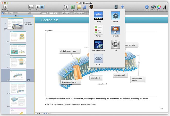 From the Multi-touch widgets selection, you can choose from a variety of widgets, to which you can add photo gallery, chapter review, movie, Keynote presentation, interactive image with callouts, 3D object, or custom HTML.