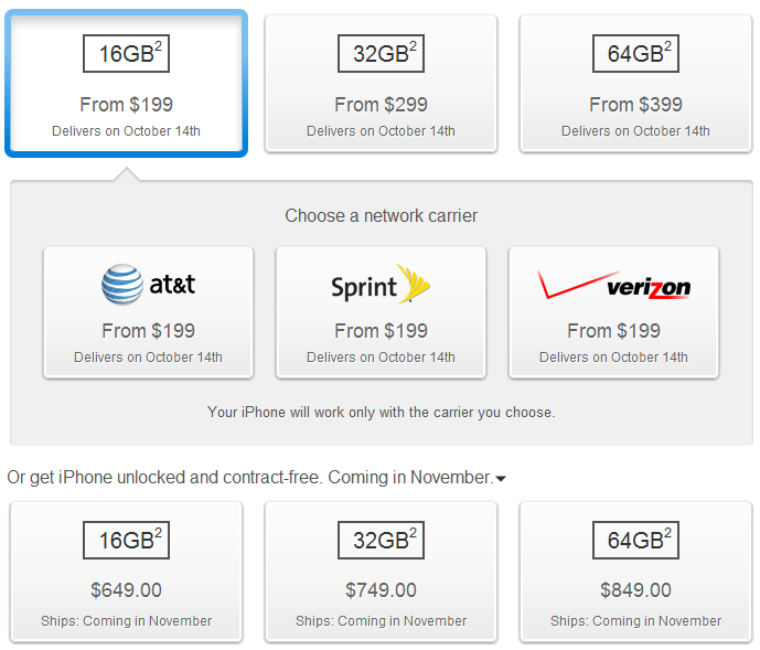 To get the unlocked version of the iPhone 4S you need to wait till the month of November 2011. For more details regarding the pricing of the phone, check out the picture above. To pre-order your iPhone 4S, click here.
