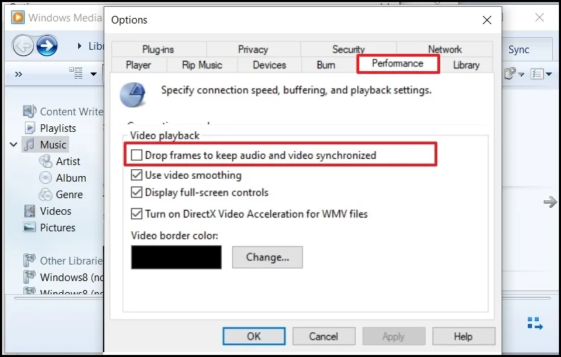 - Go to the Performance tab, tick the checkbox following ‘Drop frames to keep the audio and video synchronized,’ and click OK.