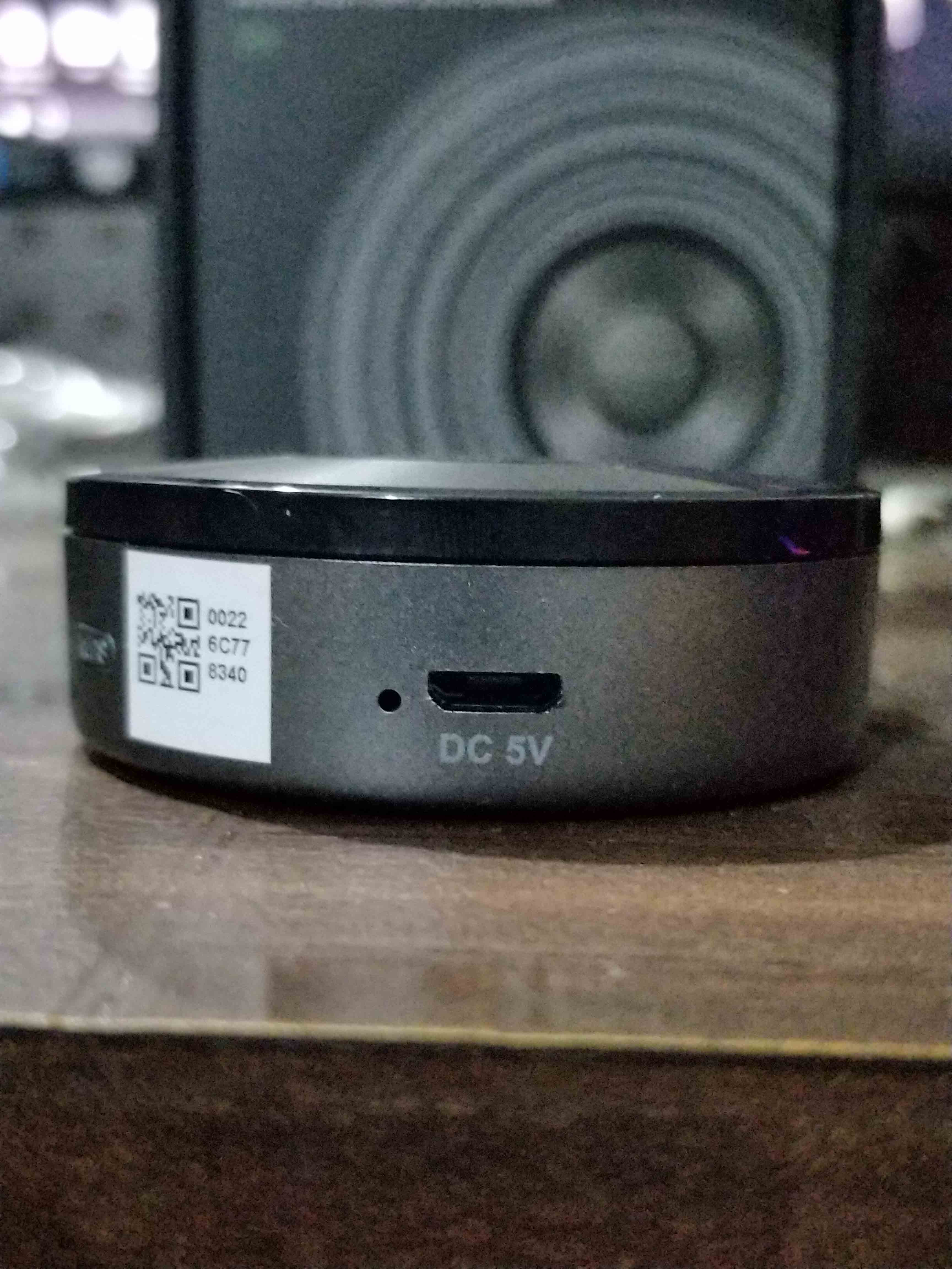 This is the 5v port for the power input. This will power up the AudioCast. The small circle is the LED indicator which will turn blue once the device is powered up.