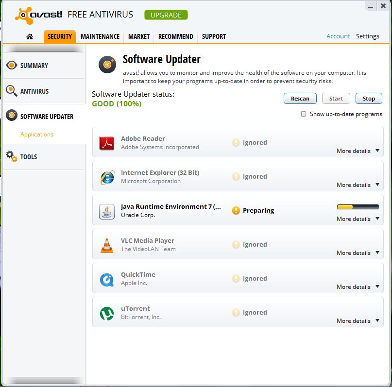 - Software Update Alerts – Avast FREE Antivirus 8 has a new feature, which lists all the installed software programs and whether any new versions are available. This might not work for some programs, but most popular ones like WinRAR, iTunes, Adobe Reader, Flash plugins etc. are included. You can even set the programs to be updated automatically when new versions are available.