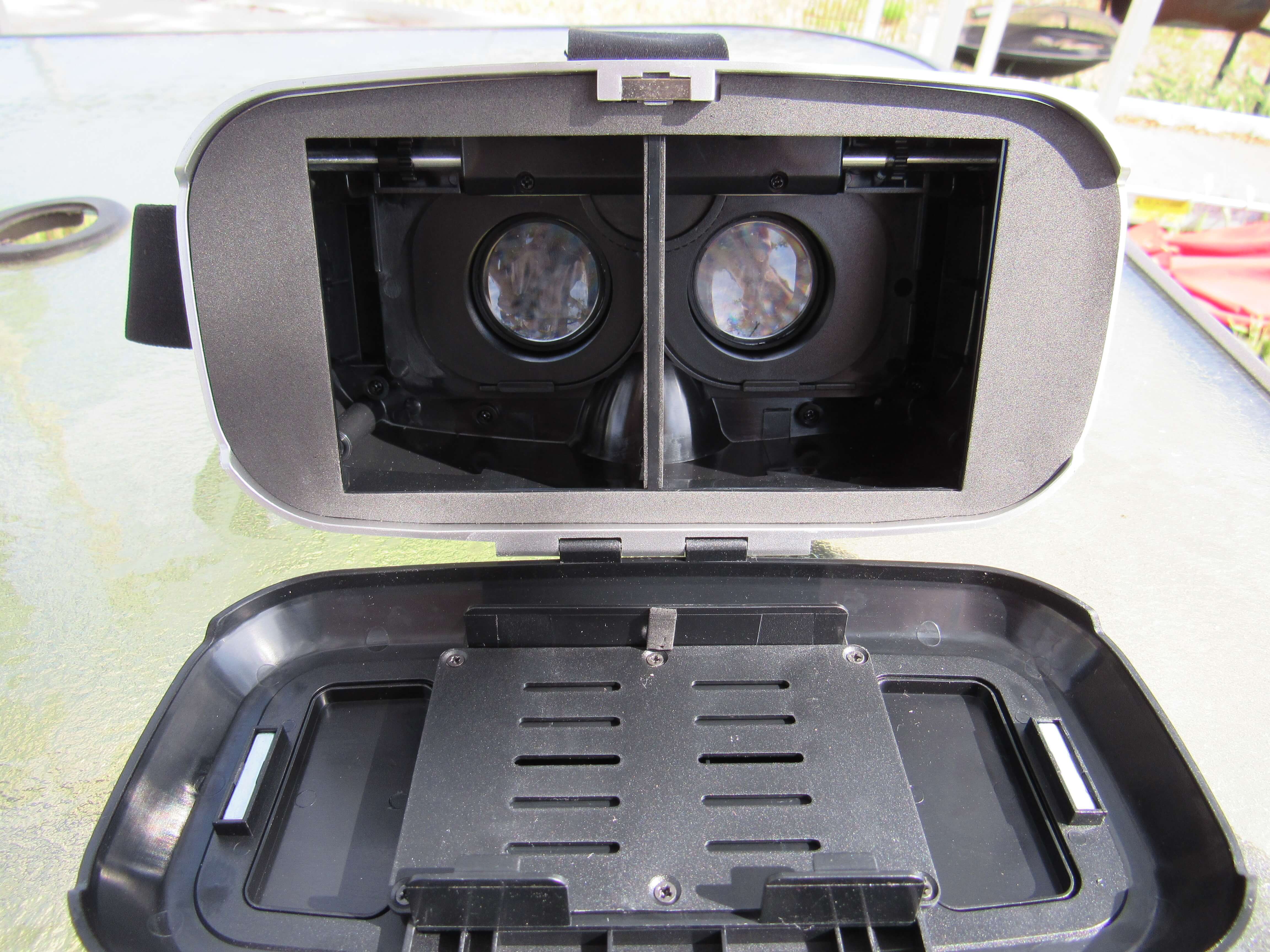 The device will hold your cell phone securely in place, lengthwise, and the whole thing closes up so that you look through two eye pieces. What you see is one image though it is really two, and that is how it works.