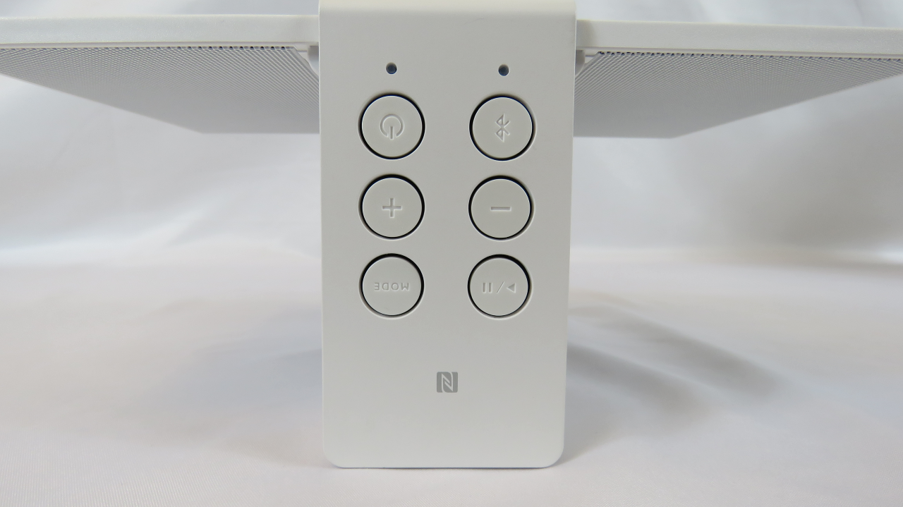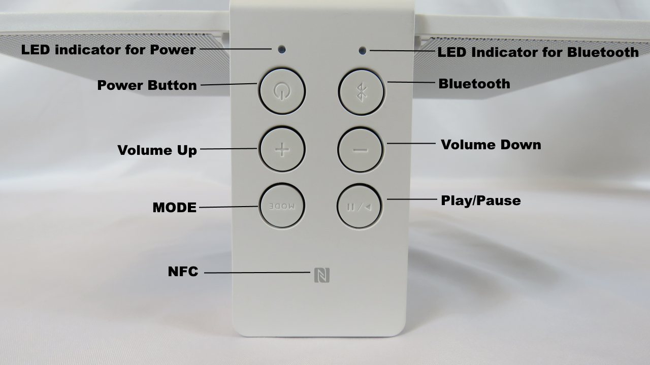 Along the top of the speaker, we find 6 buttons, 2 LED lights and the NFC logo.  The buttons here from top to the bottom are buttons for Power, Bluetooth Pairing, Volume Up, Volume Down, Mode and Play/Pause.