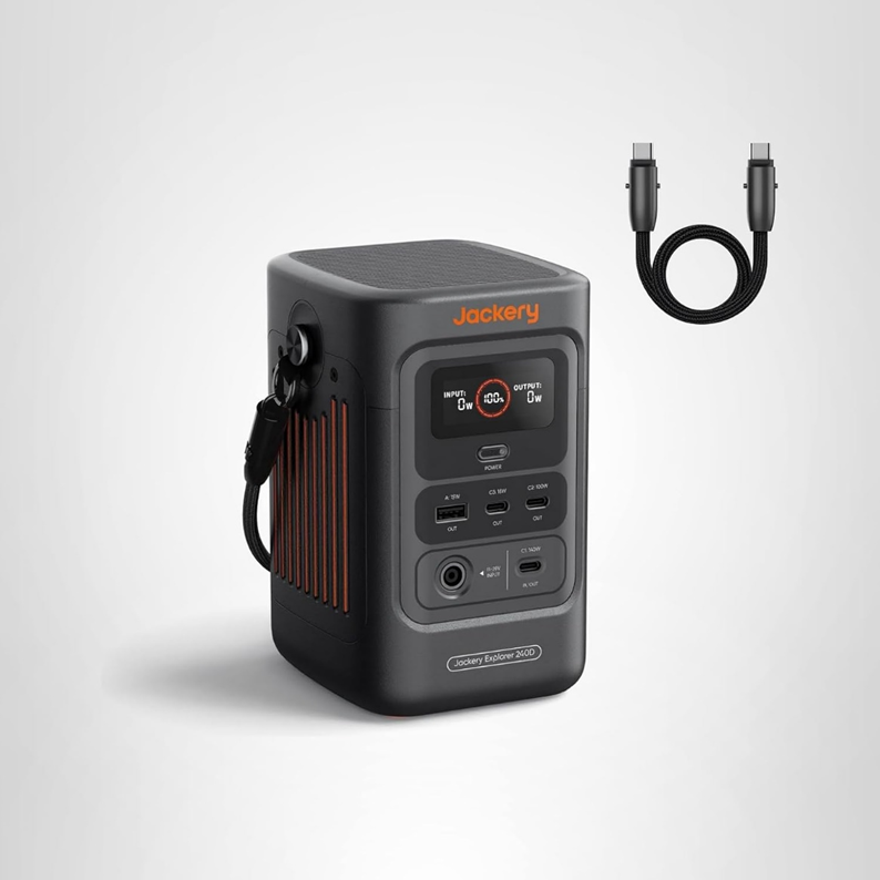 Our top pick for portability is the popular and ultra-compact Jackery Explorer 240D. It features four main charging ports: three USB-C ports and one USB-A port. It delivers a total output of up to 200W, and its 256Wh rechargeable battery is capable of charging up to 15 smartphones or 3 laptops.