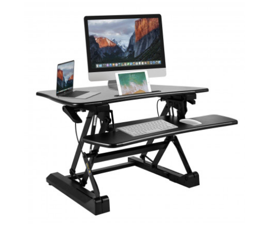 The height-adjustable desk from BESTEK is one of the cooler standing desks on the market. The best part about adjustable desks is that you can move around, sit sometimes, stand up tall, or anything else you want to do and still have your computer at eye-level. You can move the desk up and down throughout the day depending on what you’re working on. The 28″ workstation fits people up to 6.1″ tall and the 31″ workstation fits for people up to 6.5″ tall. If you’re not a fan of putting things together, you’ll be happy to know this comes already assembled. You simply take it out of the box and place it on your desktop. At its full height, it can hold up to 33 lbs, so you don’t need to worry about multiple monitors, tablets, or laptops on this desk. Unlike other standing desks, this one gives you enough room to fit all your work supplies on top of it and there’s even a slot for your tablet so you can aim it at you without a stand.