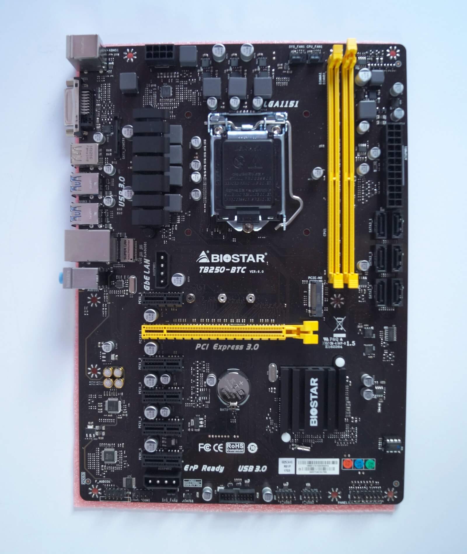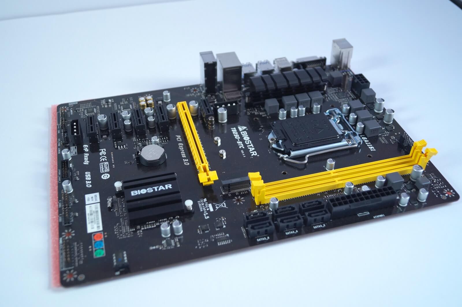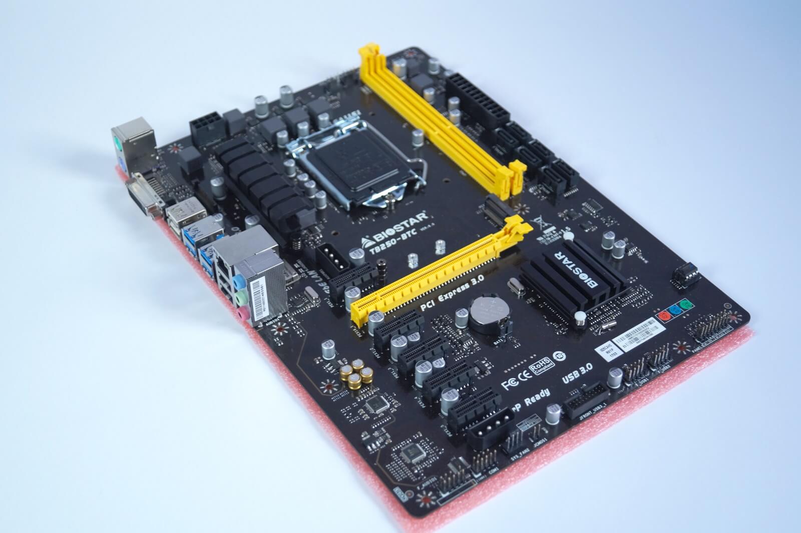 Today, we are going to take a look at the BIOSTAR TB250-BTC. This is an Intel B250 chipset motherboard, supports both 6th and 7th Gen Intel Core I series CPUs, support up to 6x GPUs and up to 32GB of DDR4. BIOSTAR TB250-BTC is one of the most up-to-date mining board available on the market right now, as not only it supports the latest generation of Intel CPUs, it also features m.2 SATA drivers.