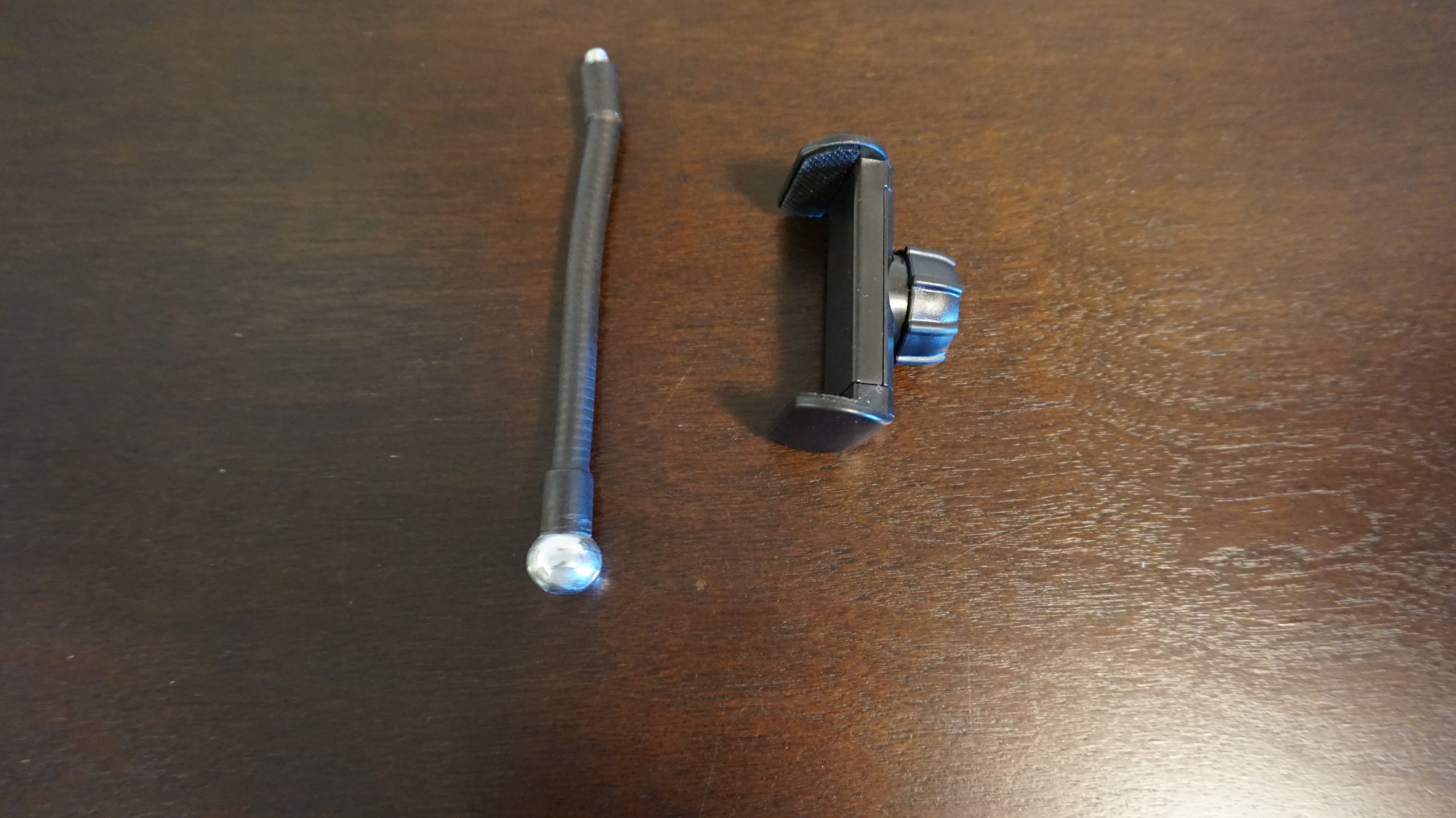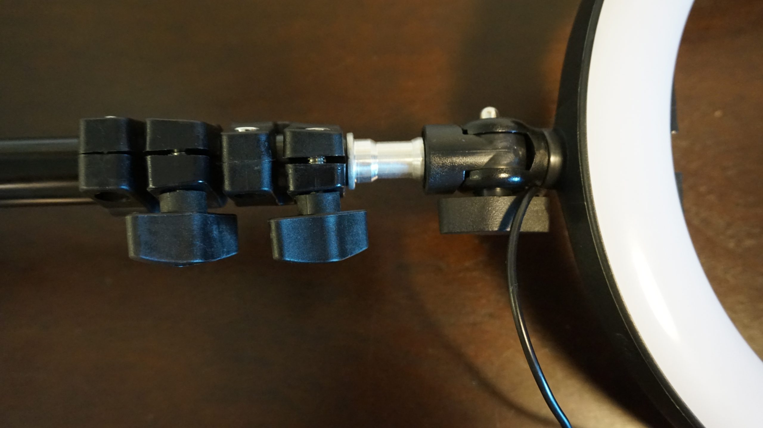The inside of the ring light is where you will screw in the phone holder. This lets you hold your phone and record your videos with the best lighting. This comes in two pieces which are the metal bendable screw and the plastic phone vice which allows phones from 2.16-3.35 inches wide. You will see in one of the photos that the plastic coating on the bendable bar is cracked but does not affect anything but looks.