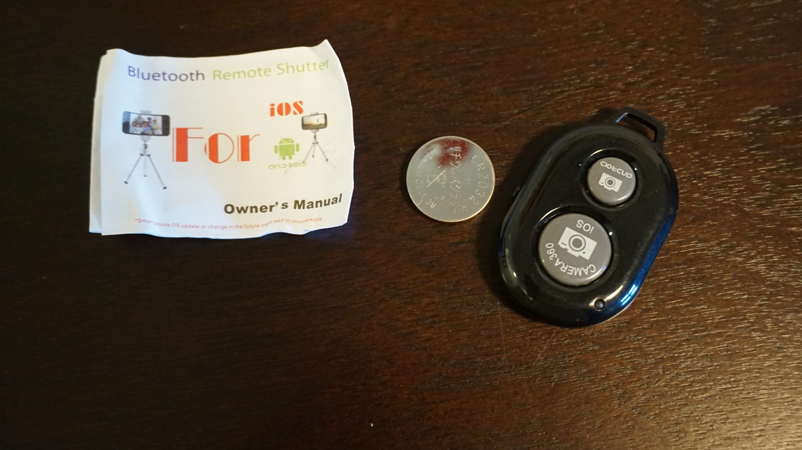 The last item that comes with this kit is a Bluetooth remote that connects to the phone. This item to me is pointless but to others will come in handy. It allows you to take photos or start recording without having to reach over to your phone if that is what you are using. It comes with two batteries one installed and one spare. You will need to connect the app they have provided to make it work.