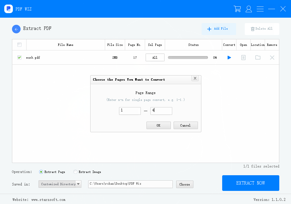 To extract specific pages from a PDF file, click on ‘Extract PDF’. Select the PDF file that you want to extract the pages or images from. Click on ‘All’ icon and select the page range. Under the operation, choose either ‘Extract Page’ or ‘Extract Image’ as per your preference. Then click on ‘Extract Now’. The extracted files will be saved in the specified directory.