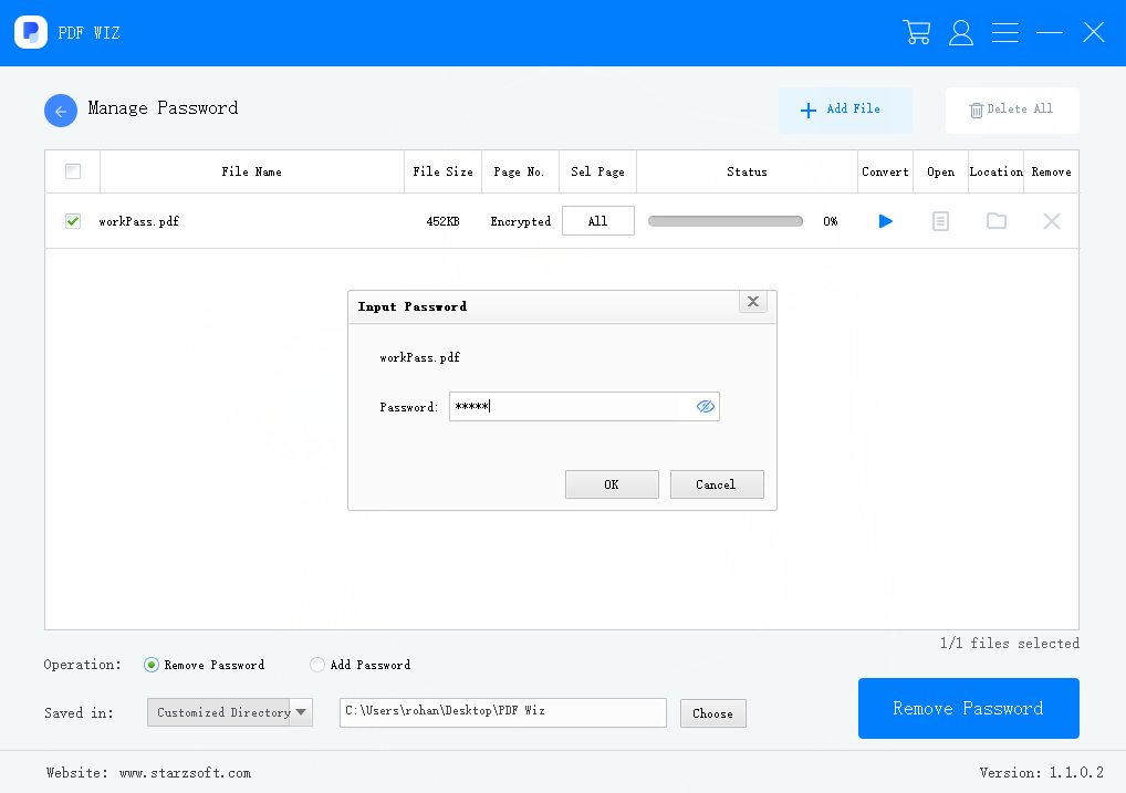 To remove the password from a protected PDF file, select the file and under the Operation tab, click on ‘Remove Password’. A popup window will open asking you to enter the password, type the password and click on OK. Then click on ‘Remove Password’ to remove password protection from the PDF File.