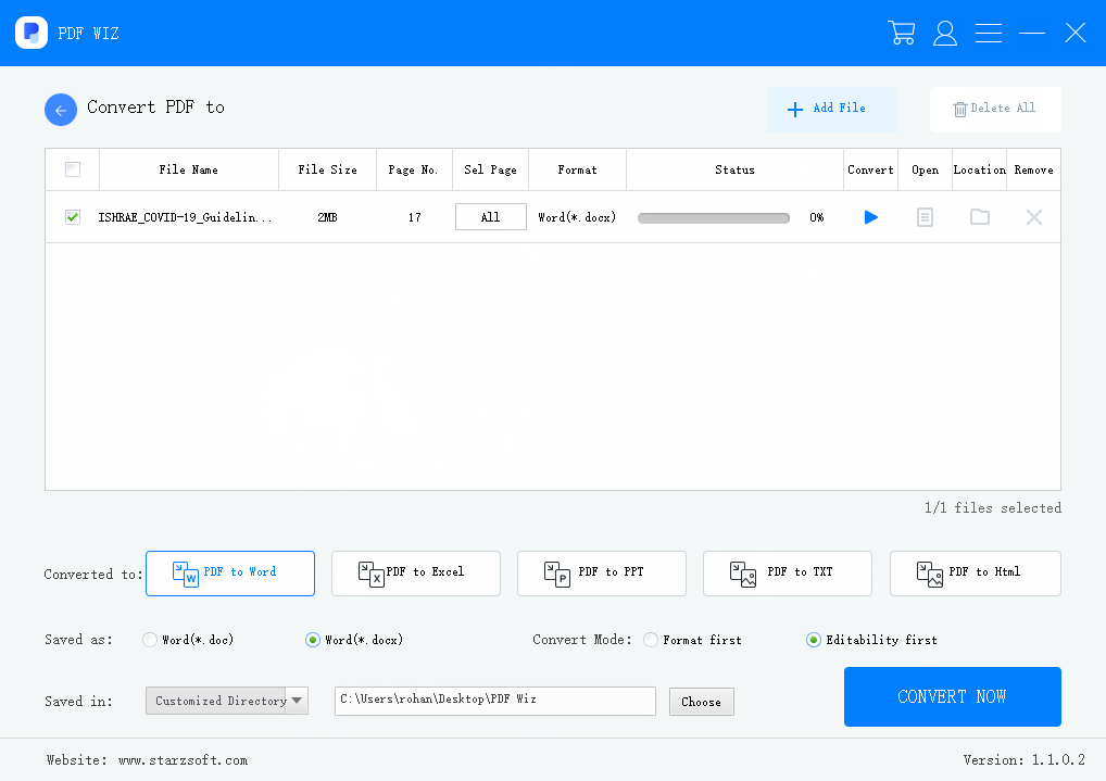 To convert Word files to PDF, click on ‘Convert File to PDF’ and select ‘Word to PDF’. The earlier steps can be followed here as well. Simply drag and drop the Word file, select the Save Directory and click on ‘Convert Now’.