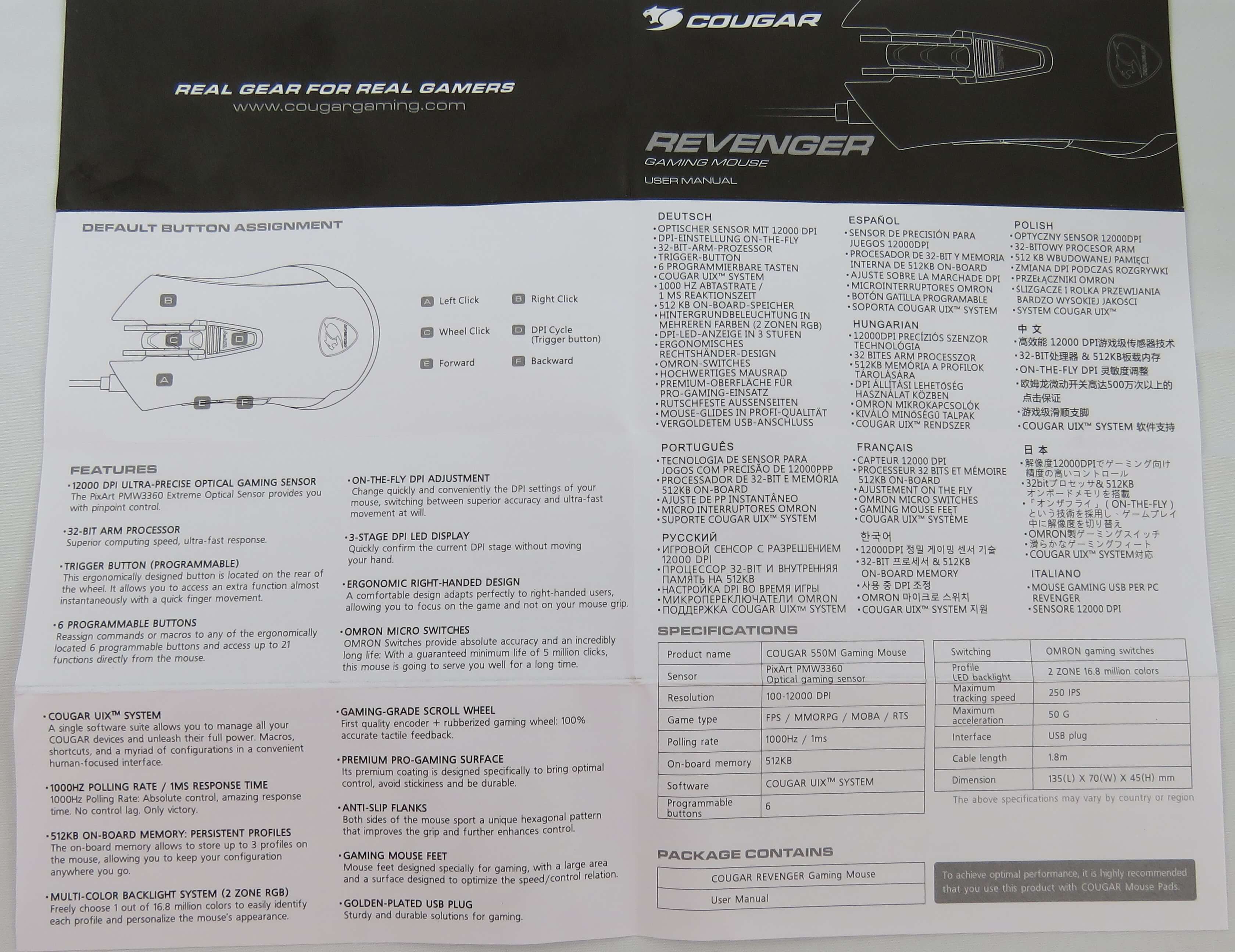 I reviewed the Cougar 550M previously and this is almost identical, but what broke the deal for me on that mouse was the price but Cougar did it right with the Revenger. The Revenger actually has everything the 550M has minus the braided cable with a better price tag and almost double the DPI.