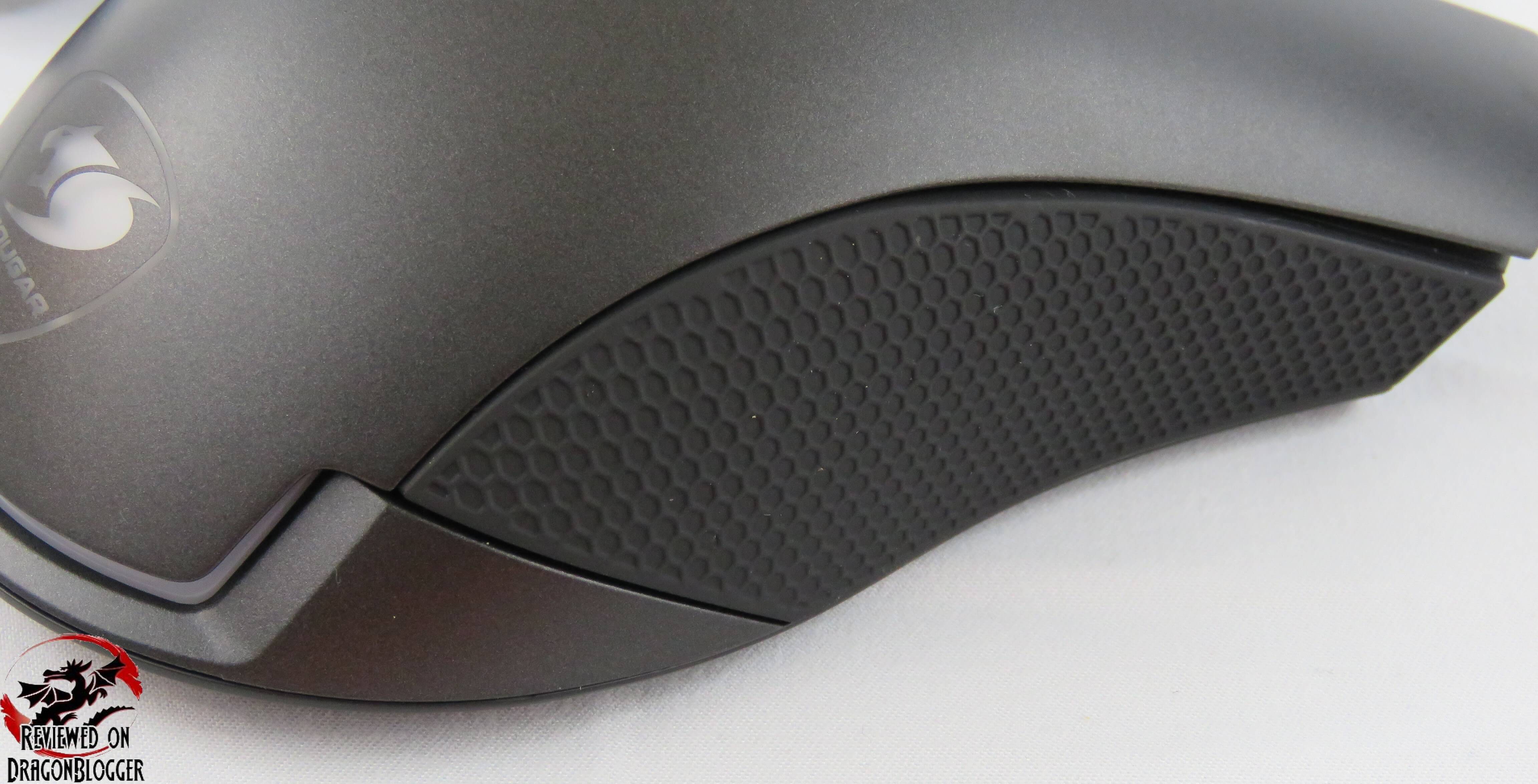 The right is basically bare, but here we can see the Anti-Slip Flanks. These little honey comb shaped groves will help your hands from slipping after hours of gaming. This is a gaming mouse, so they want to make sure you have a stable grip and it does a good job. There is another side to this, I will go over it very soon.