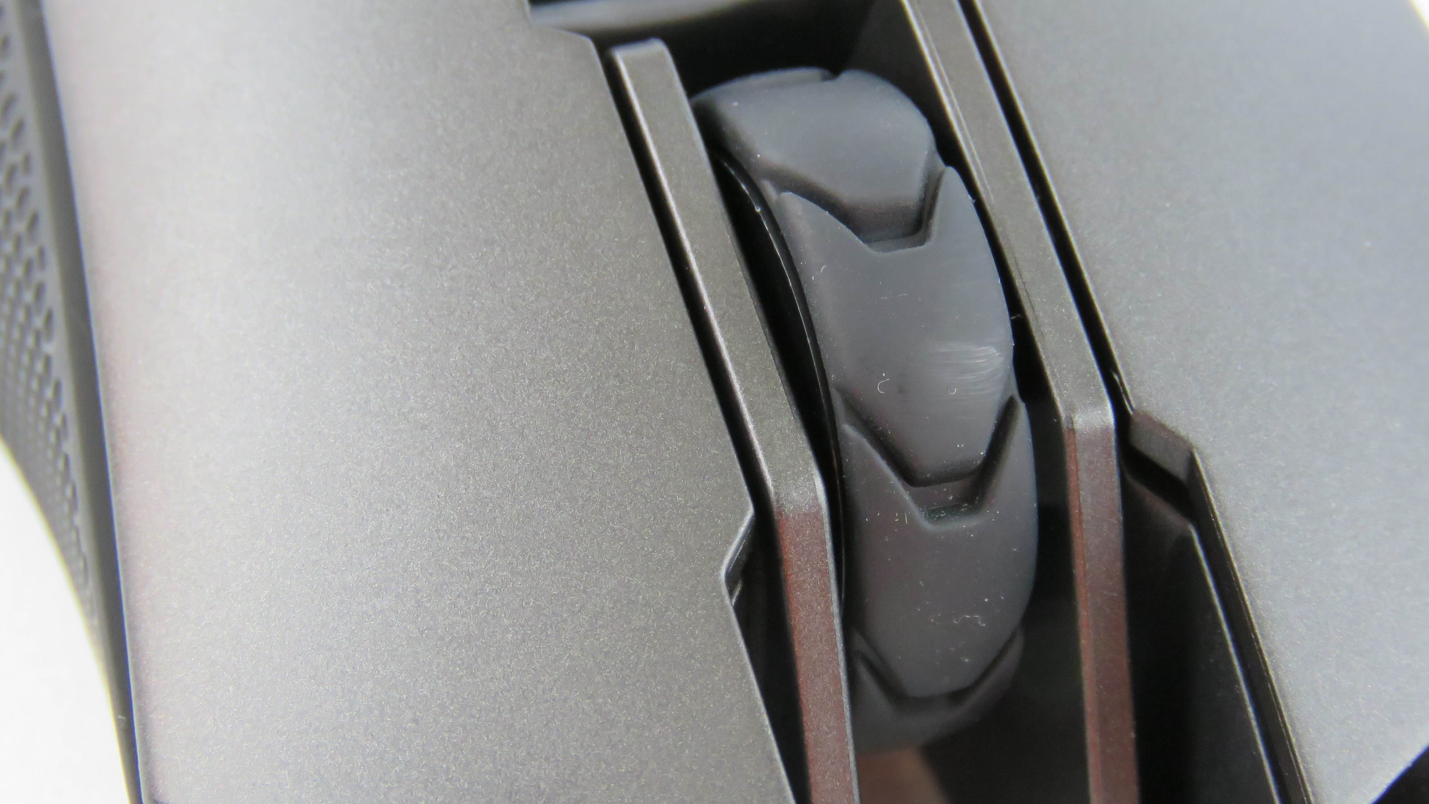 While scrolling, it’s not incredibly clicky sounding, but you can feel the rubberized rumble of it. The scroll wheel can also be used as a button, pushing it down. The entire texture of the Cougar Revenger is a very matte type feel, smooth almost rubber, it feels nice in your hands. Cougar Calls this their Premium Pro-Gaming Surface. Let’s move behind the wheel for a sec.