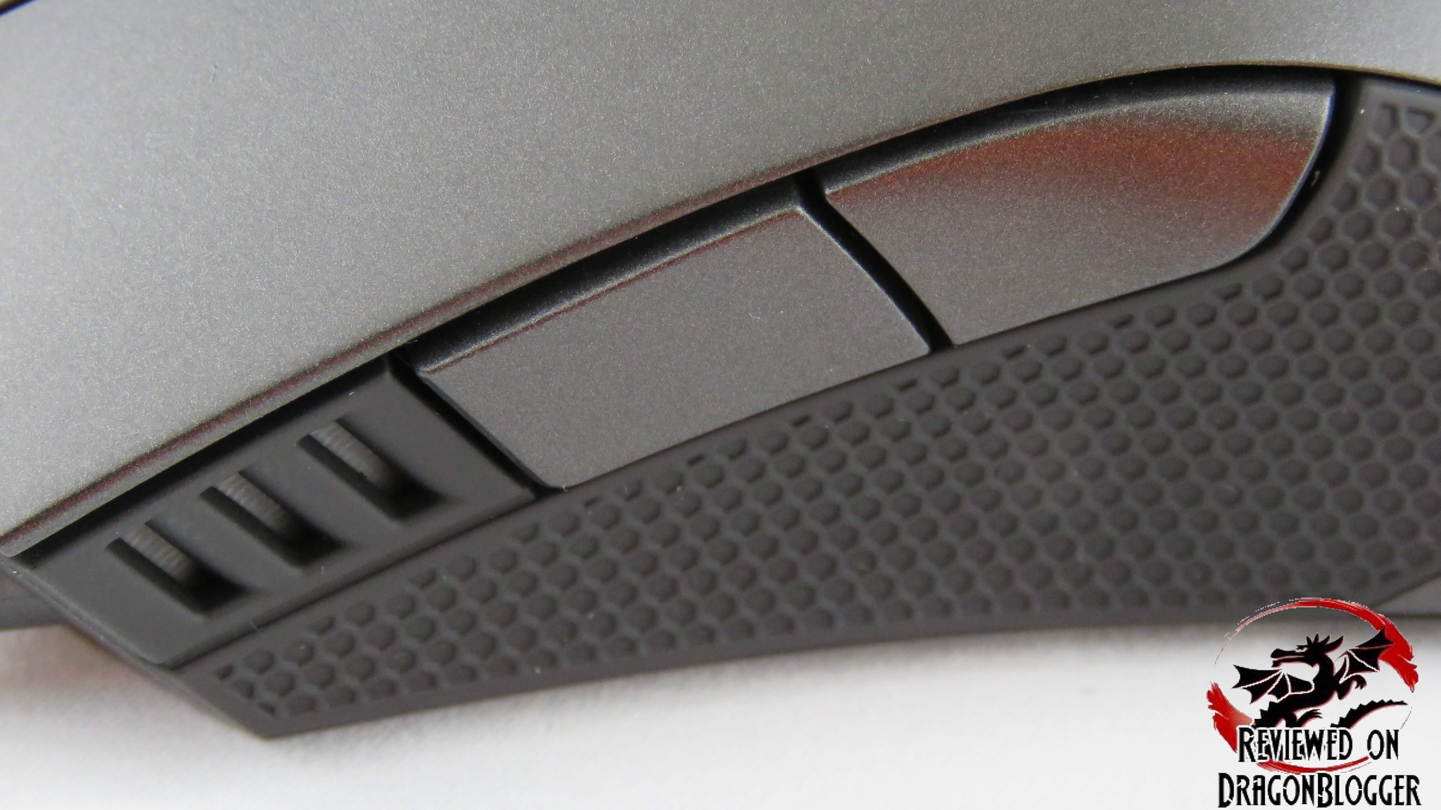 Turning it a little more to the side, we can see again the Anti-slip rubber flanks again, yup on both sides. We can also see the Forward and Backward buttons, like all of the other keys on this mouse, they can be re-purposed to function however you choose. We also find the DPI LED Display, let’s focus on this now.
