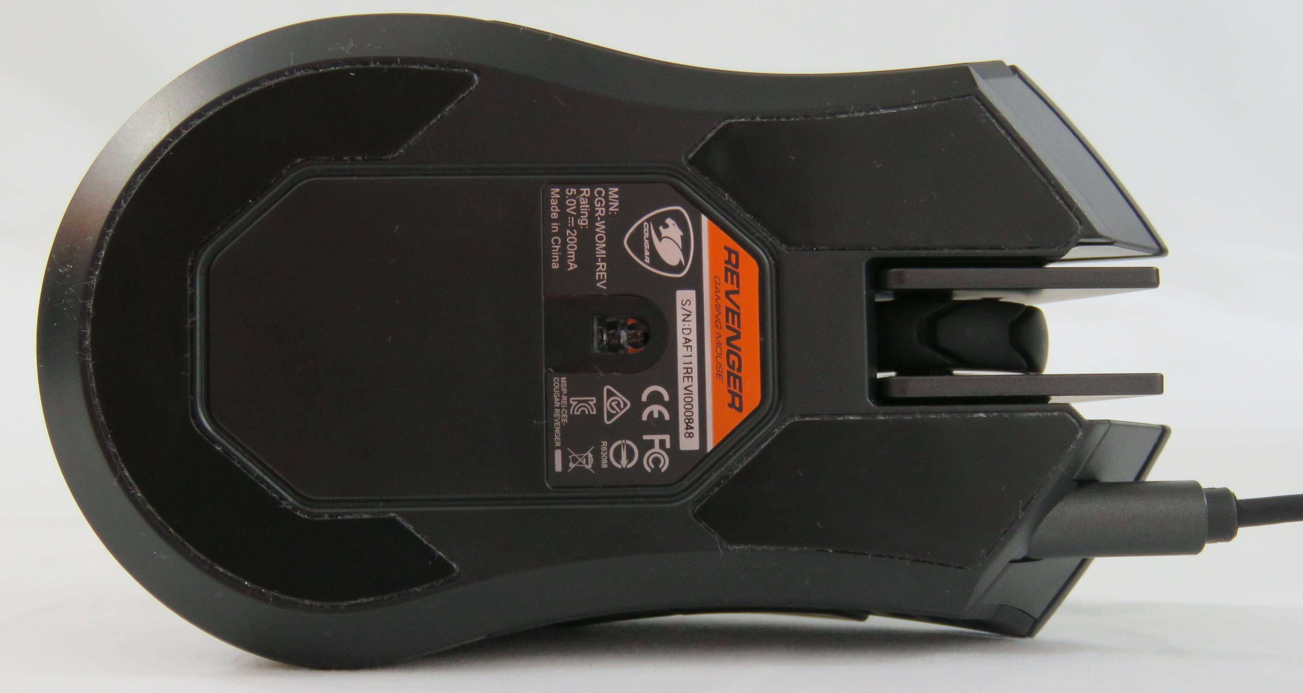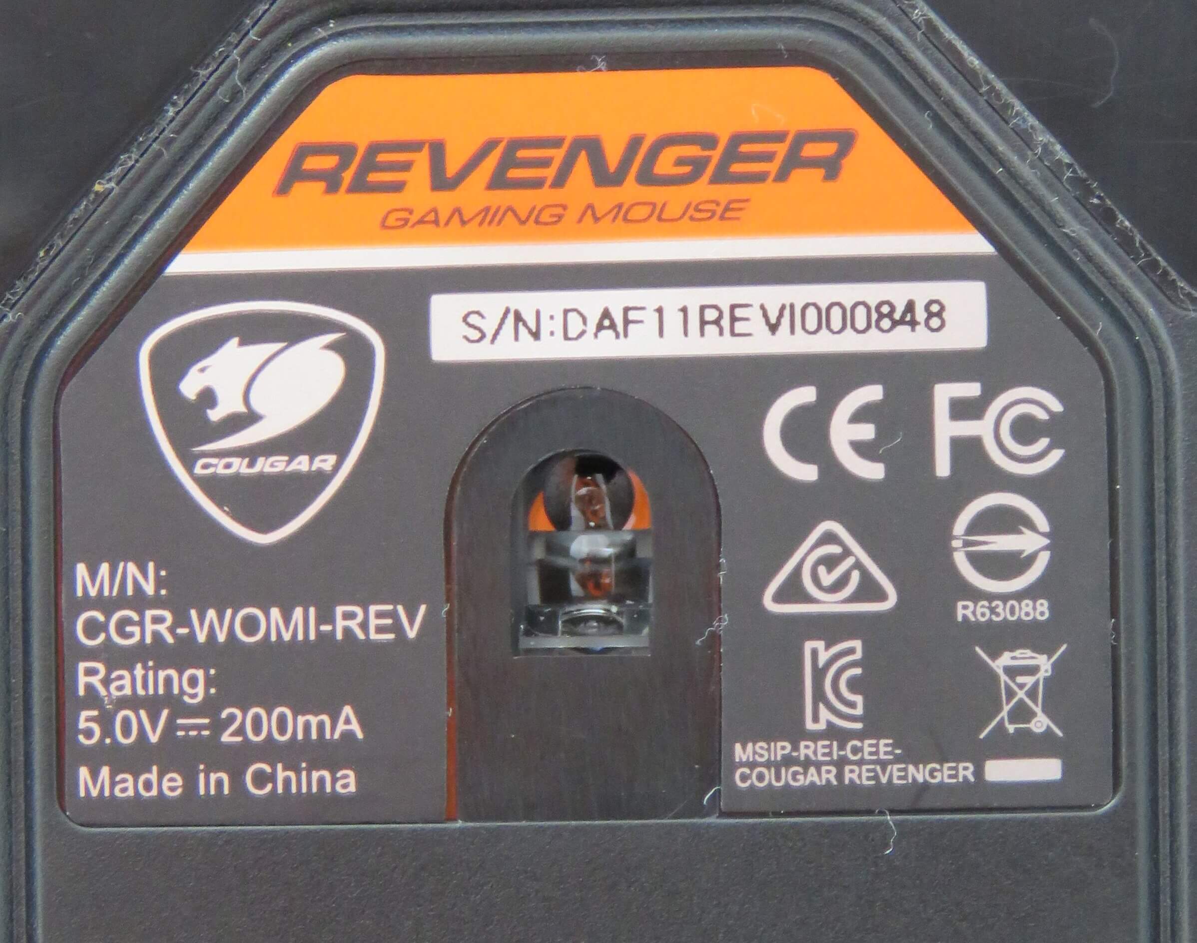 The bottom reveals the Revenger Gaming Mouse sticker, Serial Number, Model Number, all of its certifications and the Optical Sensor.