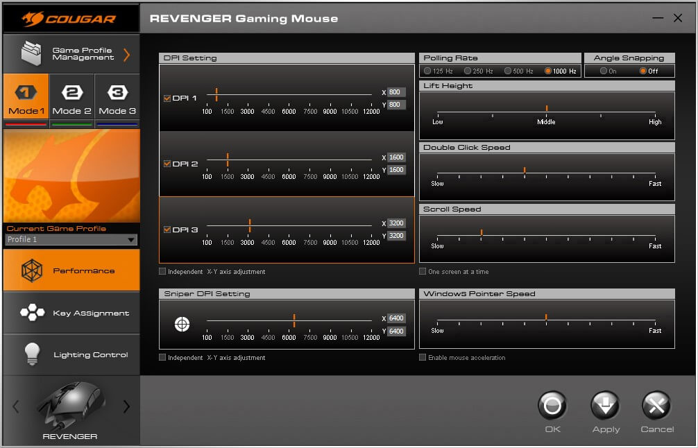 When you start it up, you will be greeted with this screen. On this screen, you can adjust the DPI, set the Sniper DPI Settings, Polling Range, Angle Snapping, Lift Height, Double Click Speed, Scroll Speed and Windows Pointer Speed, and that’s just on the Performance section. Let’s dissect the Performance section a bit.