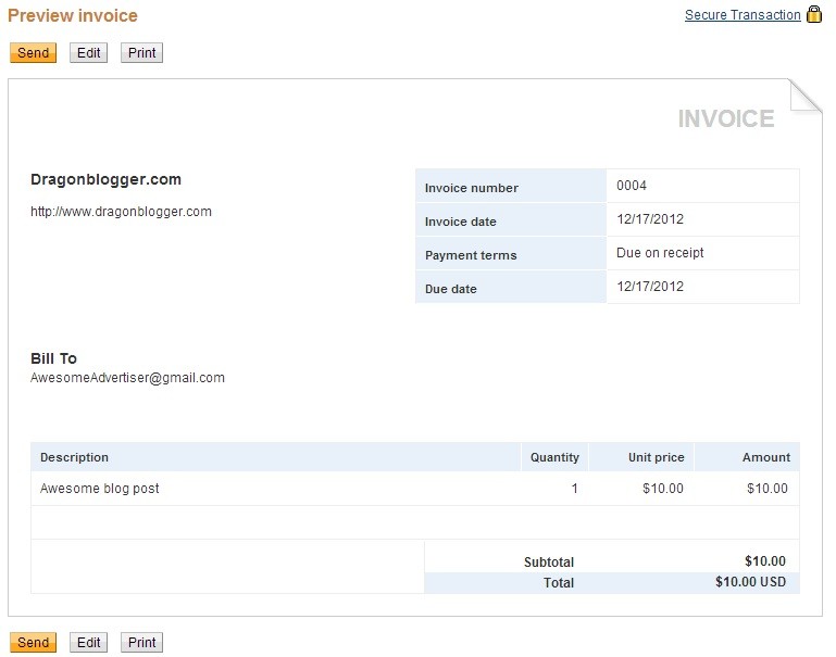 So how do you go about creating an invoice using your PayPal account? Once you are logged on to PayPal.com, click on the Merchant Services tab and then click on the “Send invoice online for fast payment” button. You are now creating your own invoice! There are four important fields that you need to fill out: Contact Information, Invoice Information, Send To information, and Invoice Details. The contact information is where you decide what personal (or blog) information you would like to have displayed on your invoices. The invoice information is where you select the invoice number, invoice date, and invoice due date. And the send to field is where you enter the Email address where you would like your invoice to go! The invoice details is where you determine the amount, the currency, whether you will be charging taxes, and other terms and conditions that you agreed with your customer. It really is that simple to create an invoice. And if you want to preview your invoice before sending it out, simply click on the preview button. Here is a quick invoice that I created in 2 minutes!