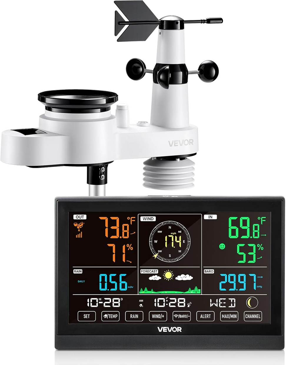 One of the main features of the VEVOR Wireless Weather Station is its integrated sensor, which handles the five most important measurements: temperature, humidity, rainfall, wind speed and wind direction. The station also provides a short-term weather forecast (6 to 12 hours), which is great if you're planning an activity in the yard or near your home.