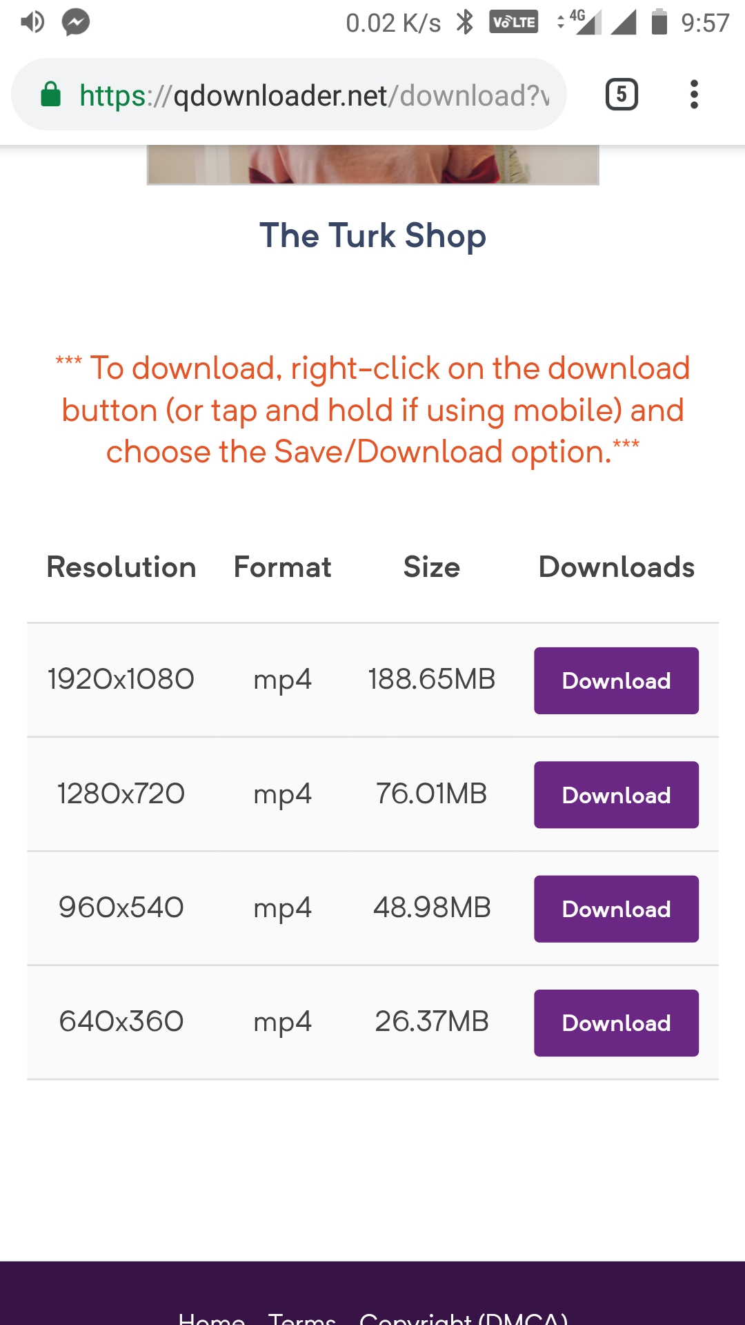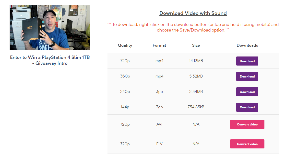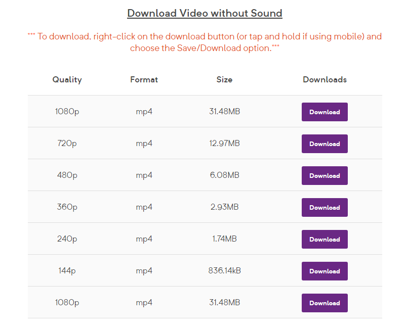 After clicking on Download, you will see various download options. The website sorts all the downloadable links in an orderly manner. Firstly, you will see an option to download the video with sound and below that will be all the download links with different video quality. Along with the video quality, you can also check the file size of the video so you can also decide which video quality you want to download depending on your internet speed and FUP quota.