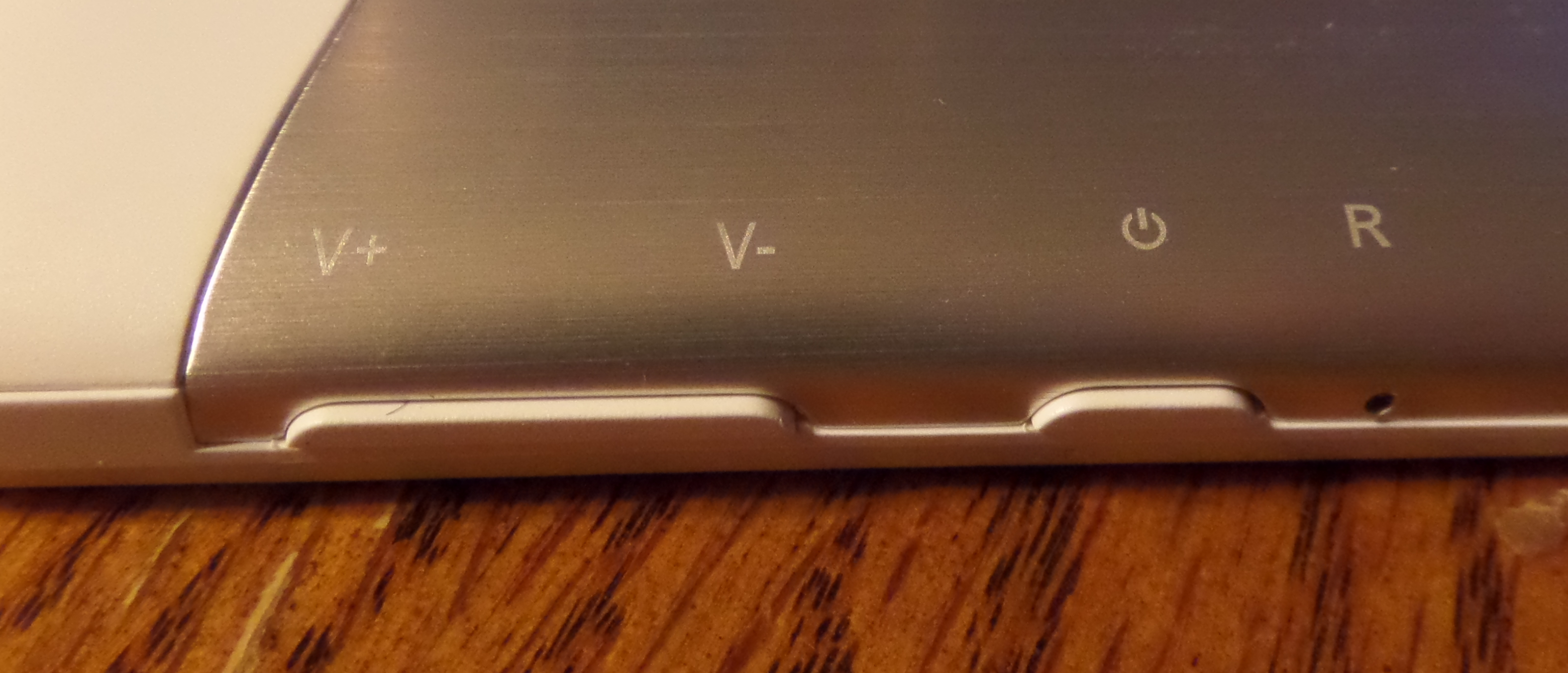 Here are the buttons along the side of this tablet. It has the standard Volume Up/Down and Power buttons and a little reset button, accessible with a pin.