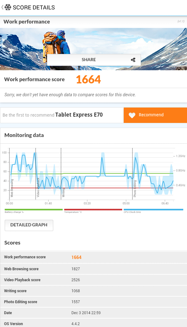 So at a score of 17933, this tablet just slightly fell short of the Asus ZenFone 5 which is a Quad Core Intel tablet at 2.0Ghz (2 x 2 cores with Hyperthreading) and has 2GB of RAM so the fact that it came so close is quite impressive. The Asus ZenFone 5 comes in at $204.99 (when I checked on Amazon), the Tablet Express is $109 (when I checked on Amazon), pretty impressive. Now some comparison between the E70 and the DTY88X.