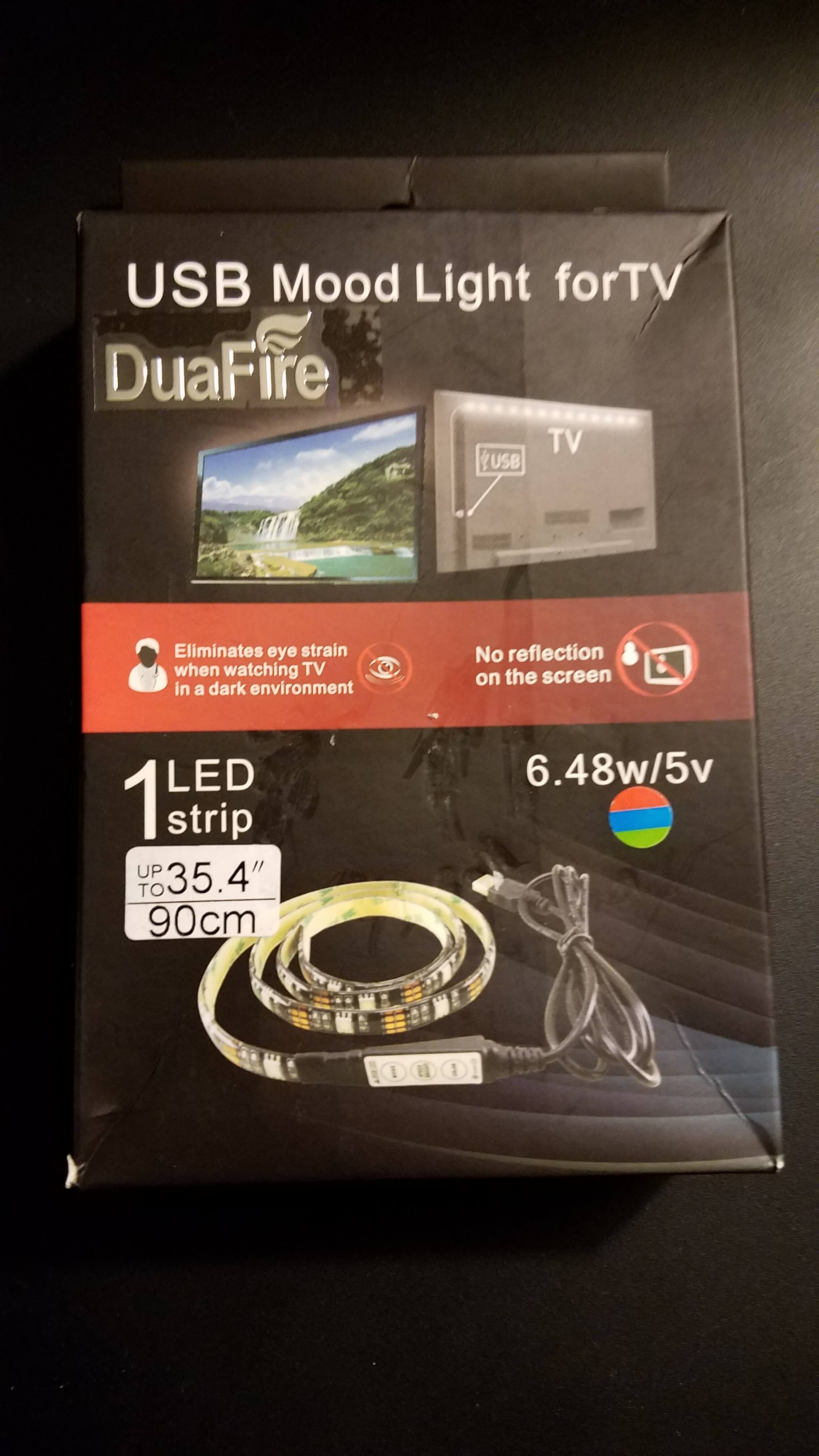 Today I will be giving a brief review of the DuaFire USB Mood Light. This particular model, the L5 model, comes in a maximum of 35.4″, or 90cm, LED strip and can be cut to fit your TV screen, PC screen or anywhere else you might want to place it.