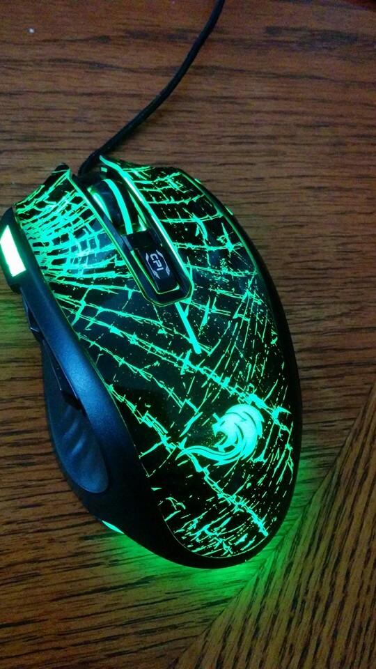 It comes with adjustable LED features that you can change at any time using the CPI cycle button. It has a cracked glass look on the top and bottom and when the lights change color it shines through the clear spots. The light will turn off when my laptop goes to sleep.