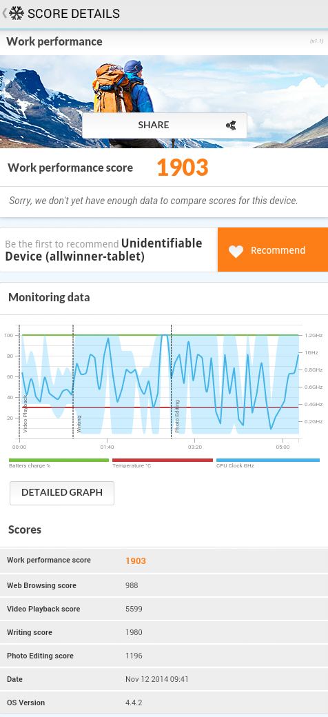 This tablet has a single core, a decent resolution (for the bunch) but no hard drive capacity, the resolution must have been what drained all its power.  Out of the 3, it scored the highest in the writing score, web browsing score and almost there on work performance, all things that require only a single core and did relatively well on video playback and photo editing, the lowest but still decent.  It seems that it handled amazingly well the very simple tasks, but when it got to where it needed to handle video playback and use its decent resolution screen, I guess it was too much of a task.  At the end, only stayed alive for 1 hour and 37 minutes.
