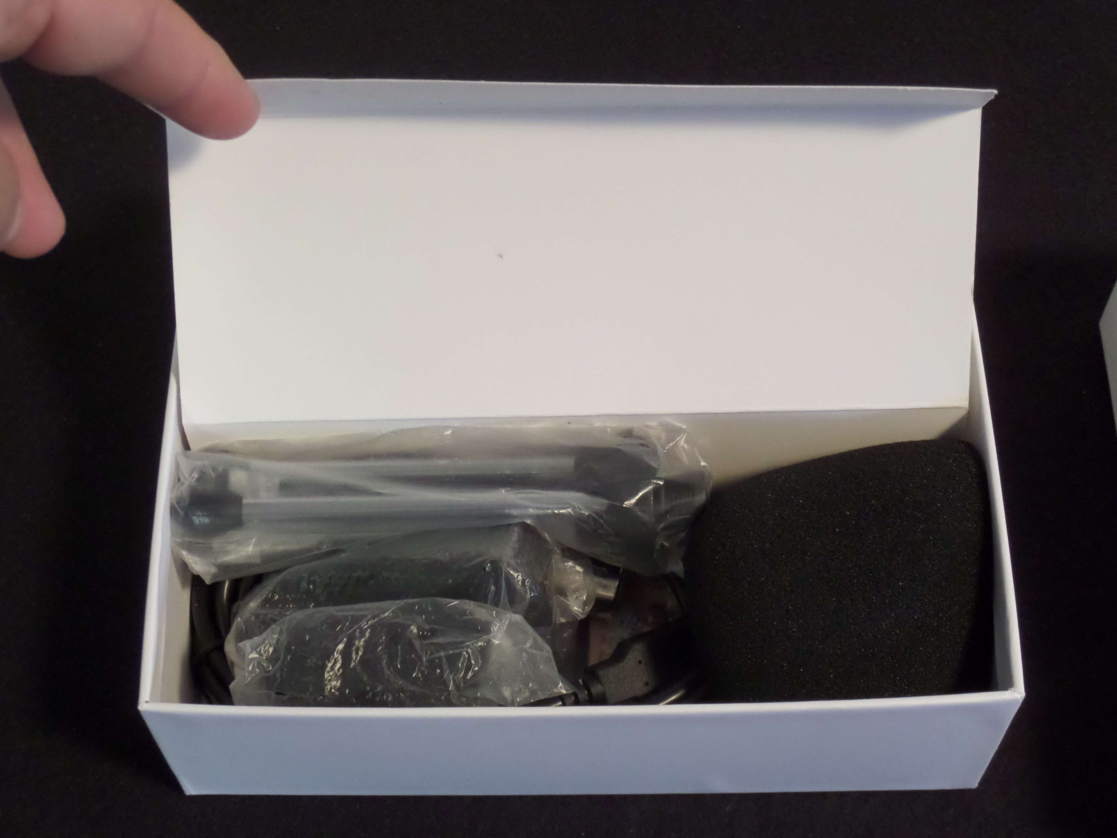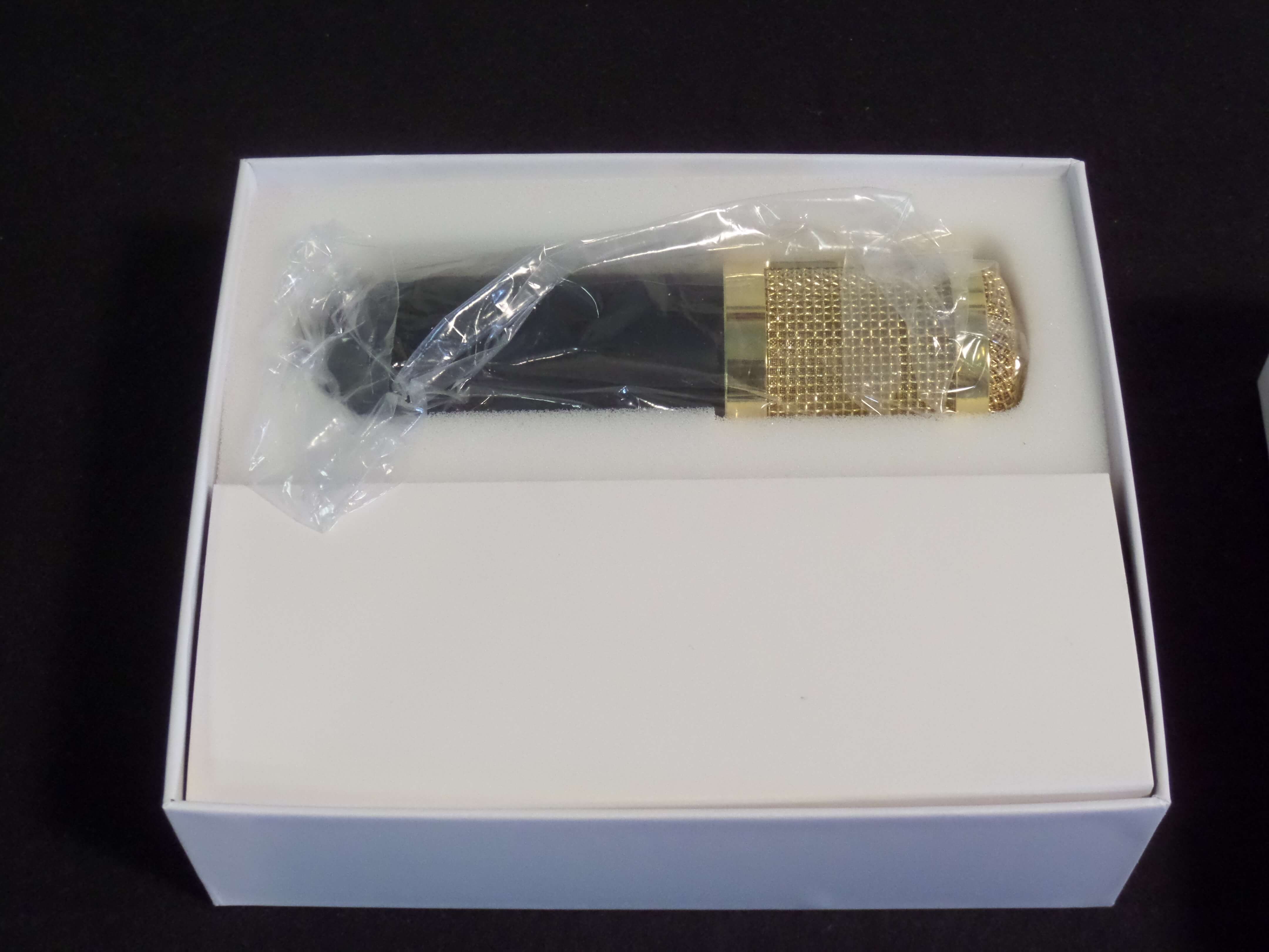 In the above photos, you can see that you get a microphone a windsock, a cord, and a tripod. You can also see that the microphone is a black and gold color. The gold is supposed to be gold plated.
