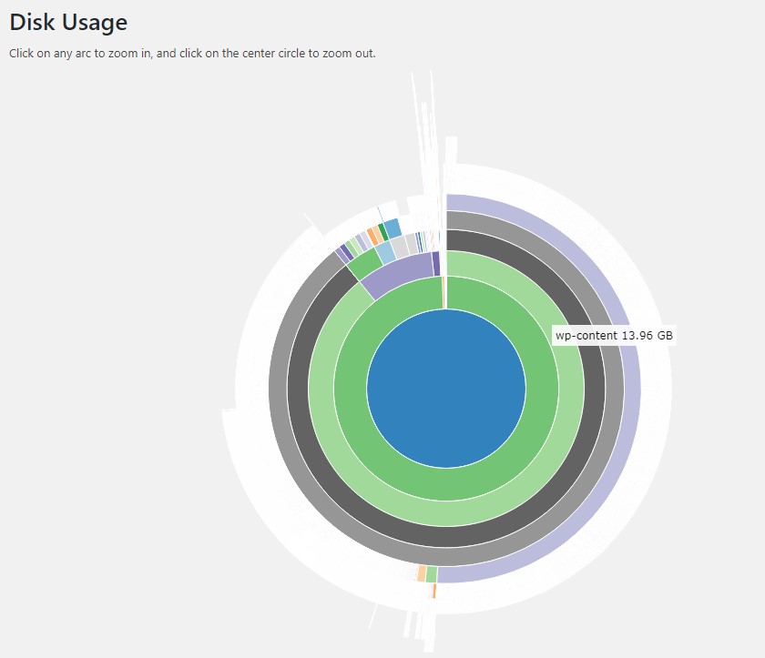 Your center or sun is the root or parent folder of your WordPress install and the corona’s or layers are the sub-tree folders, so you can see that my wp-content had 13.96 GB and you can see the specific folders organized by colors to easily identify folders taking up the most space.