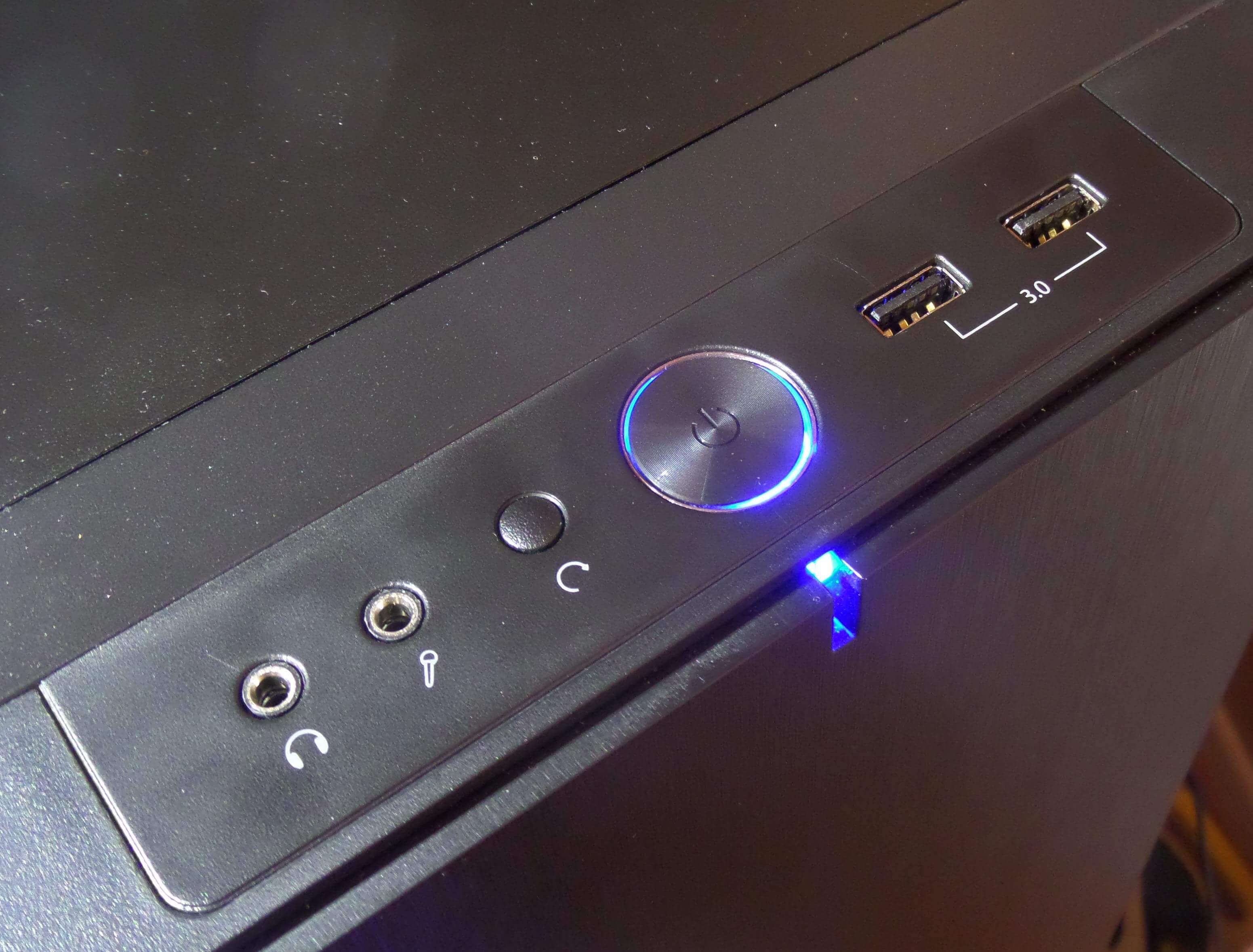 On the top of the case, here you can see the Heaphone and Microphone jack, Reset button, Power button and 2 x USB 3.0 ports. Notice that the blue LED light also surrounds the metal power button, a nice touch.