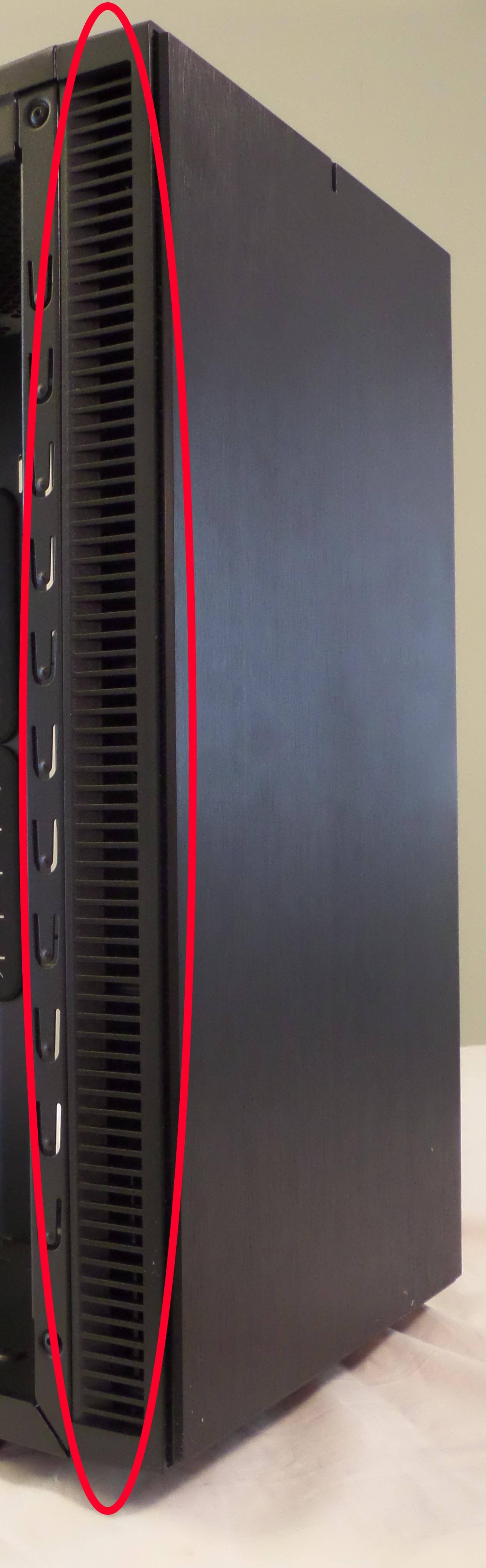 I circled it in red above, the other side is the same. I thought that these would suck in too much air causing it to sound like air being blown through a straw, but I was wrong. It does a nice job of cooling the case.