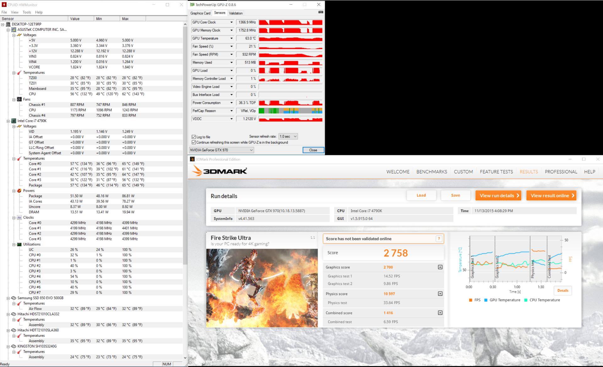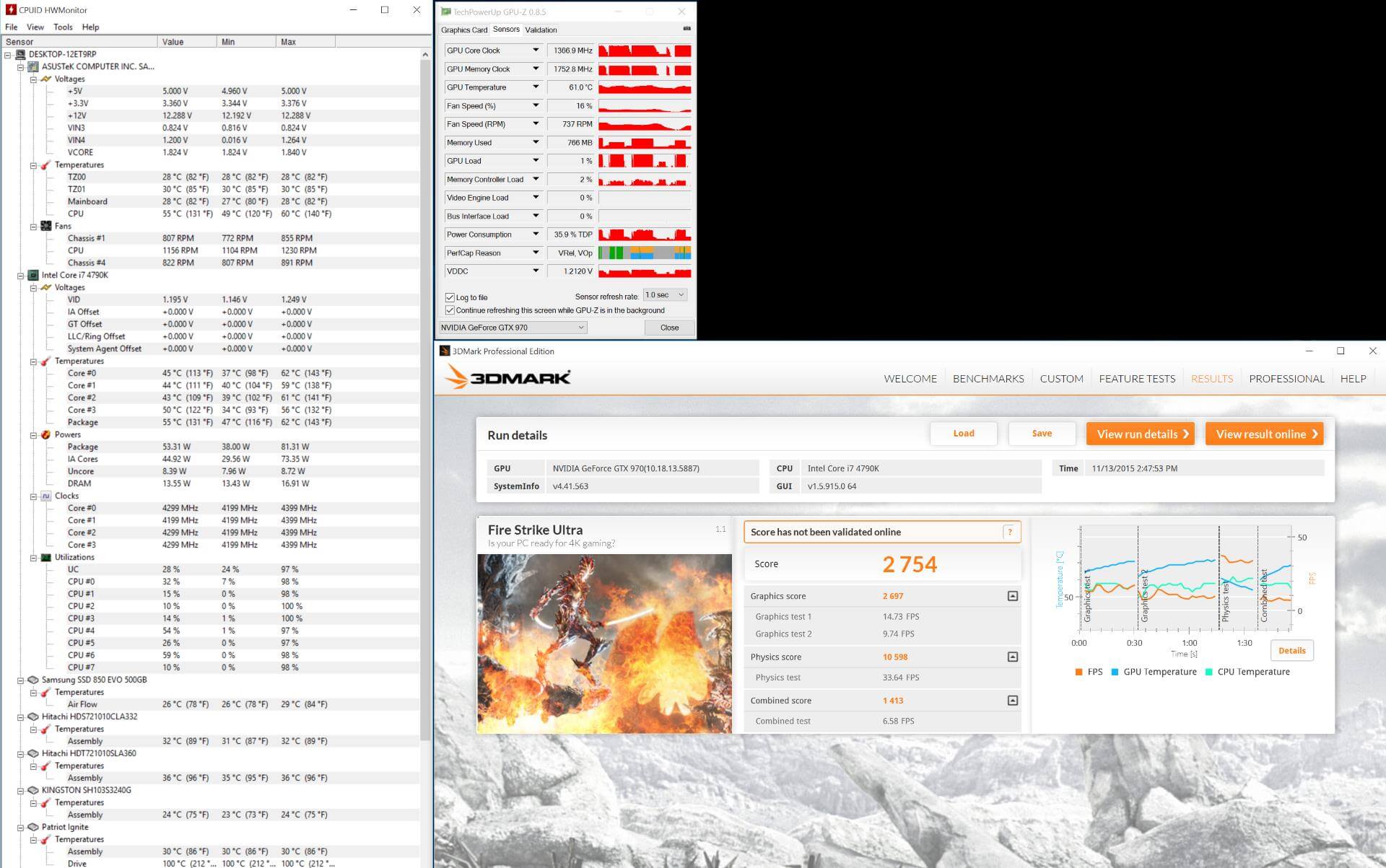 The hottest the GPU got in 3DMarks Fire Strike running at Ultra was 74°C and the CPU 62°C, these are the temps testing without a fan on the side panel. Average temperature of the GPU was in the low 60’s.