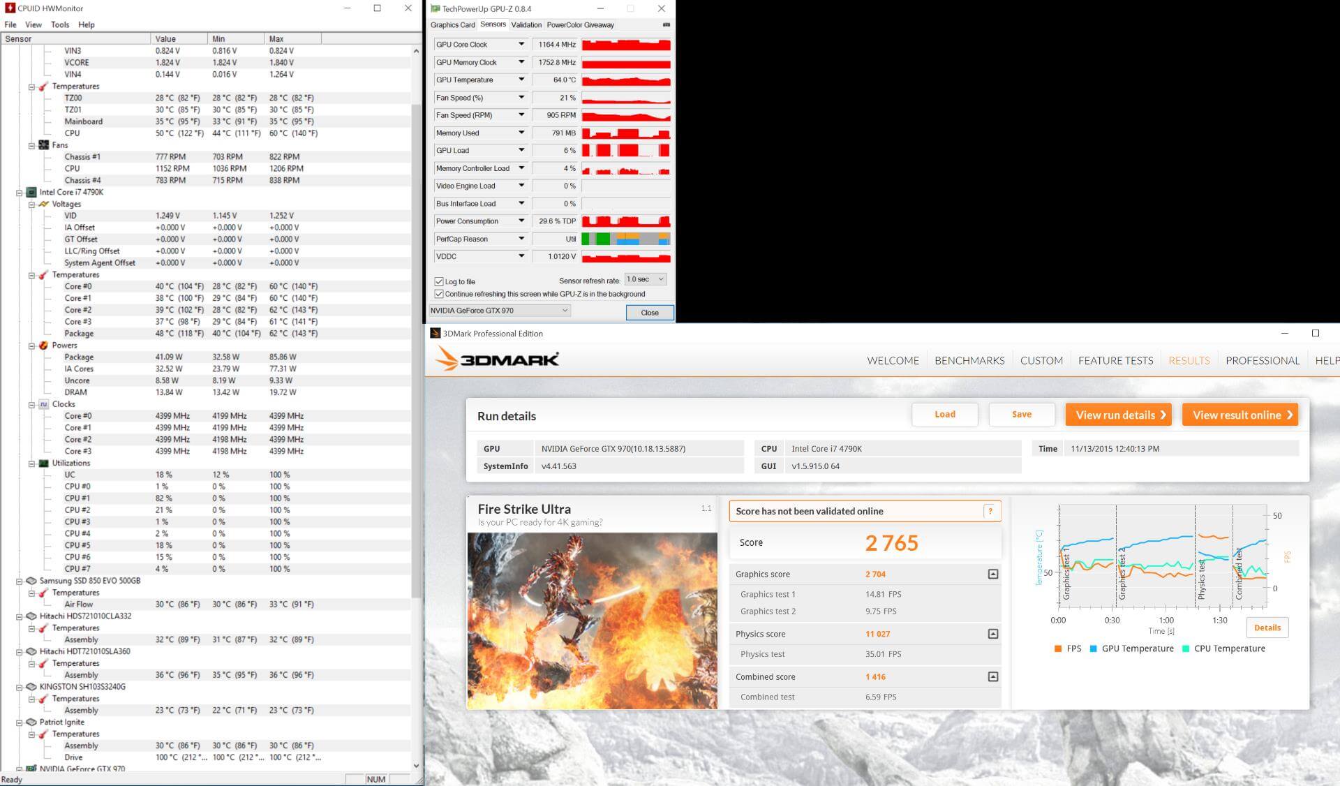 Just above was we can see the hottest the GPU got in 3DMarks Fire Strike running at Ultra was 74°C and the CPU 65°C, these are the temps testing with the windowed sidepanel. The average temperature of the GPU was around 44°C. Remember, the windowed side panel has no noise dampening so it does get just a bit louder.