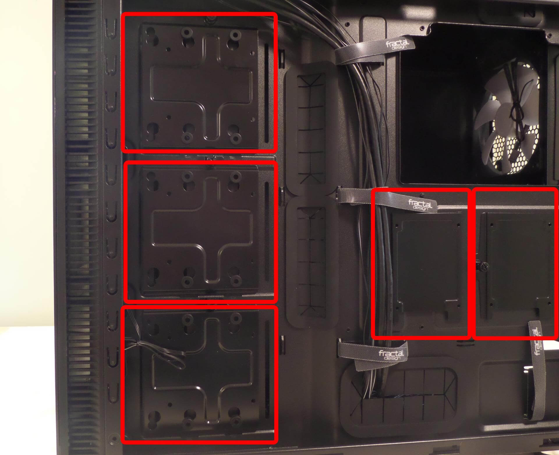 Zooming out a bit more, we can see where the 3.5’ drives fit, as well as the 2.5’ I showed you previously. I outlined them in red for you. Here you can also see all of the Velcro straps.