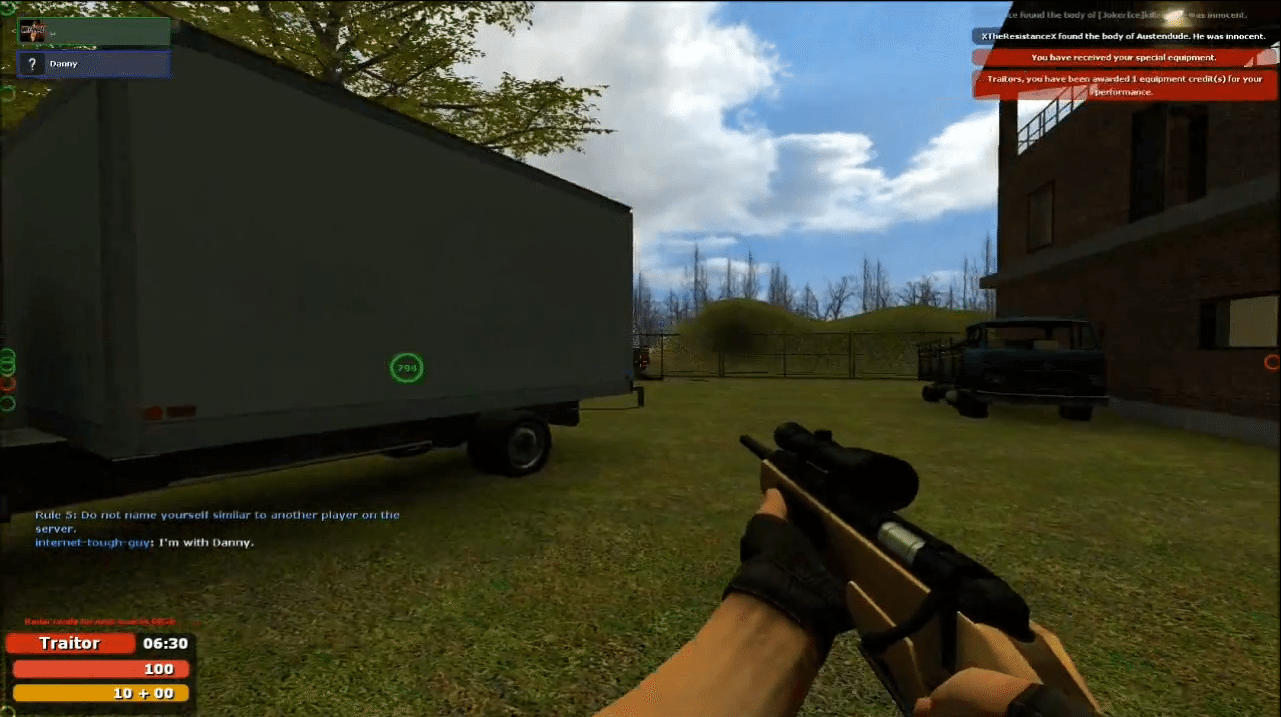 This game mode is arguably the biggest game mode of them all, with over 2000 servers there is plenty of people who play and enjoy Trouble In Terrorist Town and rightly so! The game is very enjoyable and is incredibly addictive due to the sleuthing done by players. Trouble In Terrorist Town (TTT) is a game mode which has taken Gary’s Mod in style because of it’s wonderful gameplay mechanics. In TTT players are devised of two teams, innocents and traitors. The round ends when one team wins. In a usual game there are roughly 90% innocents and 10% traitors and games with under ten people only have one traitor.