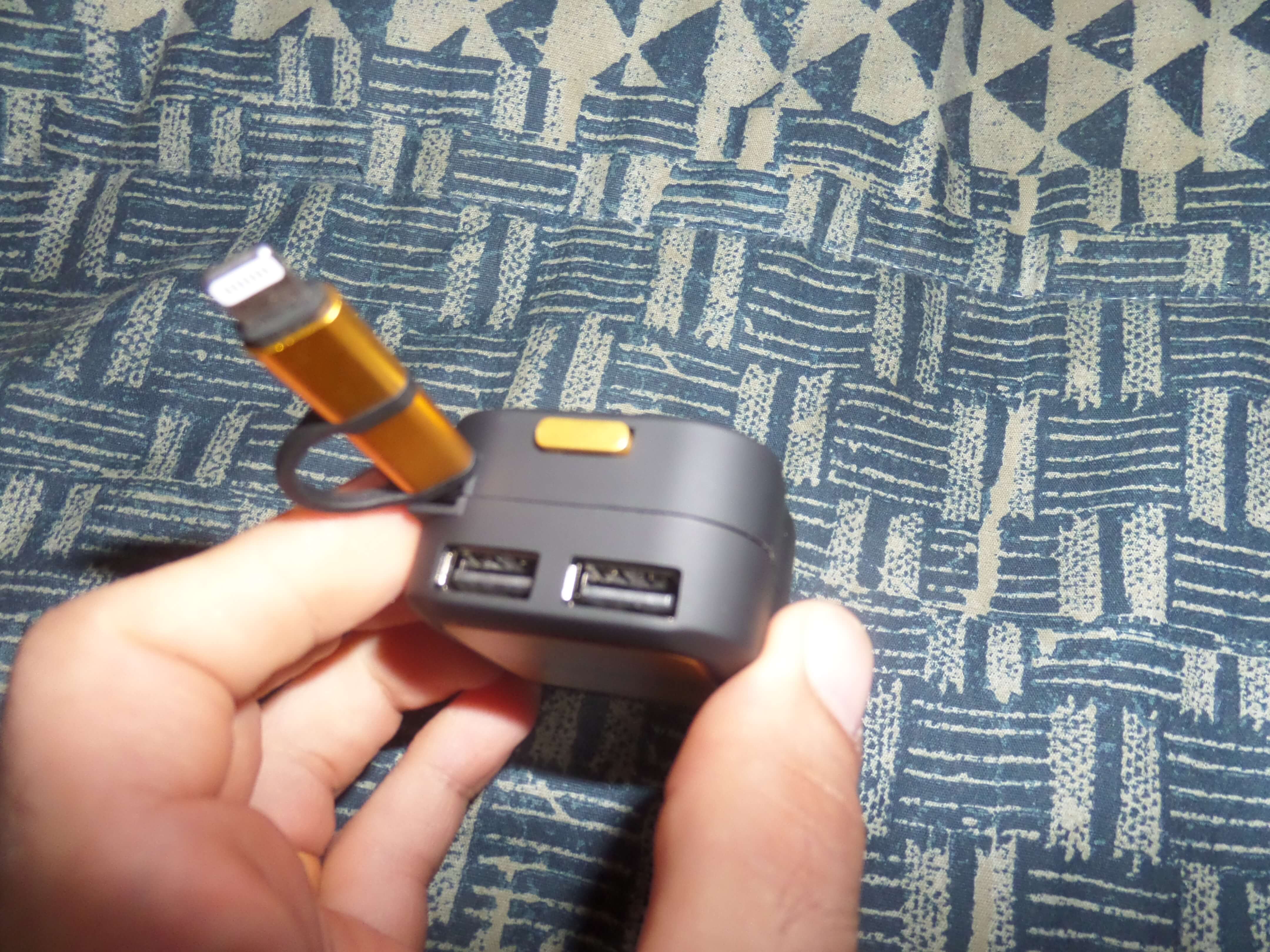 There is a center button that retracts the cable when you extend it, and the cable which extends to 3′ is pretty long and can easily reach from the front outlet port in the car to the back to charge devices for people behind you while driving. The one built in plug actually has 2 heads, a MicroUSB head that plugs into a Lightning head and you can detach and use one head or the other, so this makes it out of box ready for any USB charging device based on those two charging ports, without you having to use a separate cable.