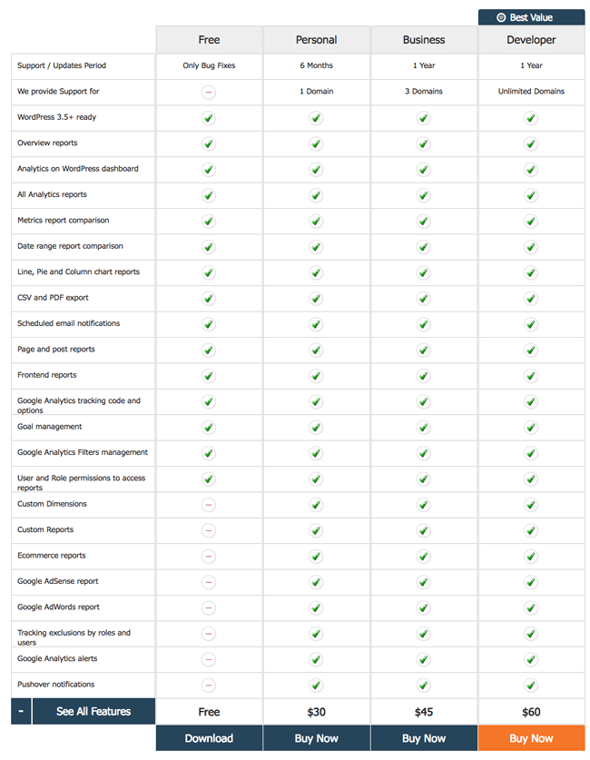 Find below the full list of features and functionalities that the FREE and PRO versions of Google Analytics WD come with. Also, check the WordPress Google Analytics demo to see exactly how it works.