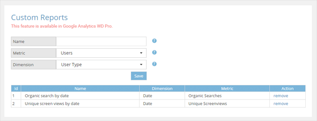 Apart from the built-in report types that Google Analytics WD comes with, you can also set custom reports on any metric and dimension and view the related statistics from the plugin’s reporting page. There is a separate section for custom reports where you can make all the necessary configurations. You give the report a name, select the metric and dimension, and the plugin will automatically add it to the reporting page. For example, you can choose “page” as a metric and “duration” as a dimension, and get reports on the time your visitors spend on specific pages on website.